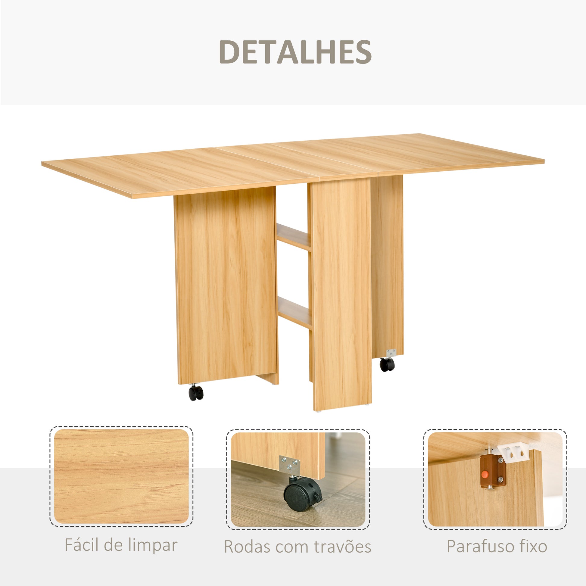 Esta mesa de sala de jantar dobrável com rodas é a solução perfeita para espaços limitados, com medidas de 140x80x74 cm e cor de madeira natural.