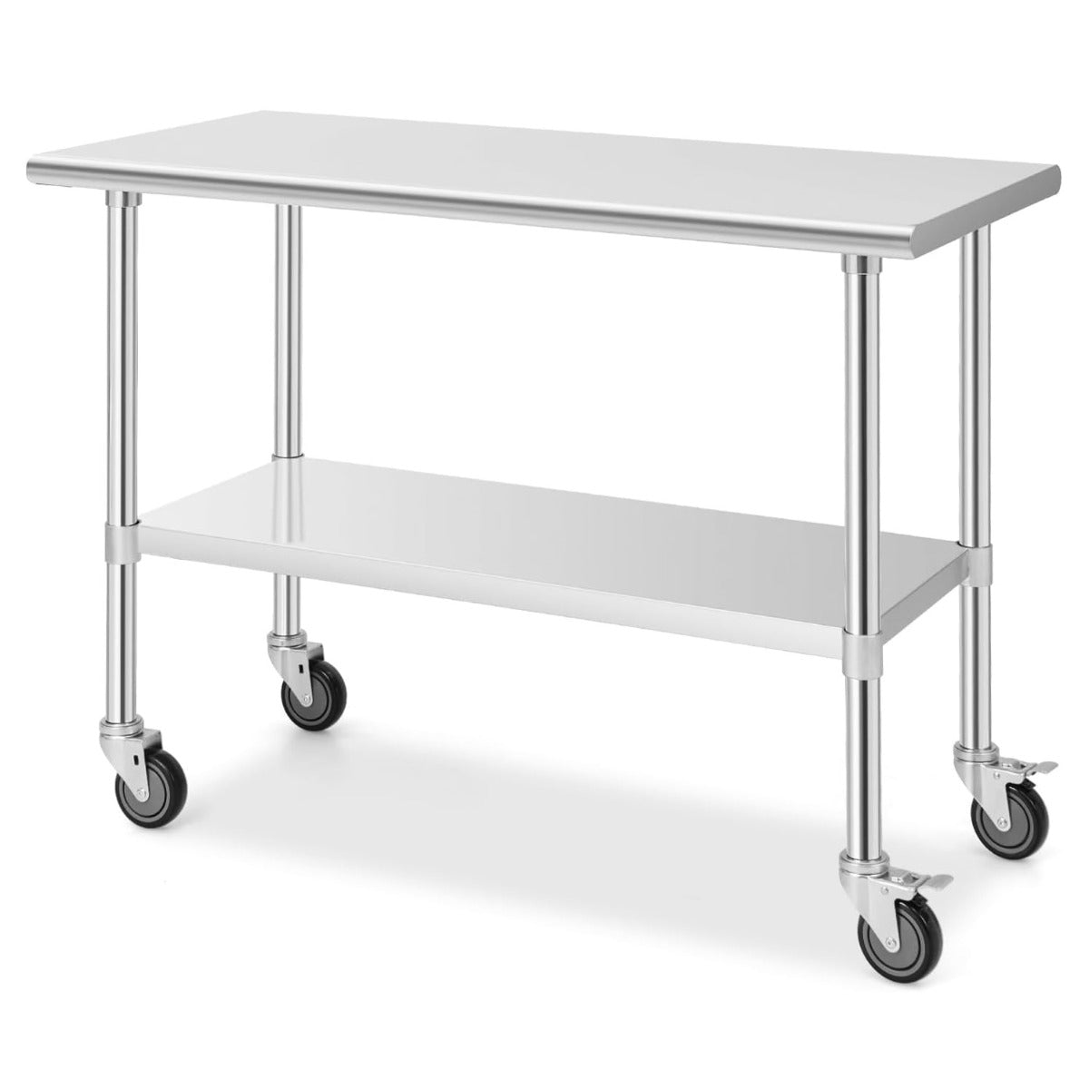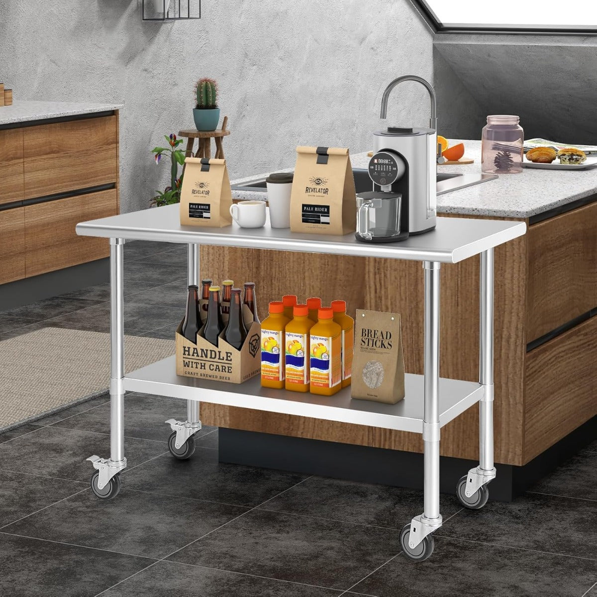 Se deseja manter a sua cozinha organizada e arrumada, esta mesa de trabalho em aço inoxidável com cantos arredondados e rodas é uma excelente opção. Fabricada em aço inoxidável, a parte superior é escovada, resistente a riscos e à corrosão. A ampla e plana superfície da mesa permite acomodar uma variedade de itens, sendo segura e não tóxica para manusear alimentos. A prateleira por baixo da mesa de aço inoxidável pode ser ajustada conforme a dimensão dos objetos. Além disso, esta mesa de trabalho em aço inoxidável possui quatro rodas universais que se movem facilmente para qualquer lugar, com duas rodas com travão para maior estabilidade durante o trabalho.