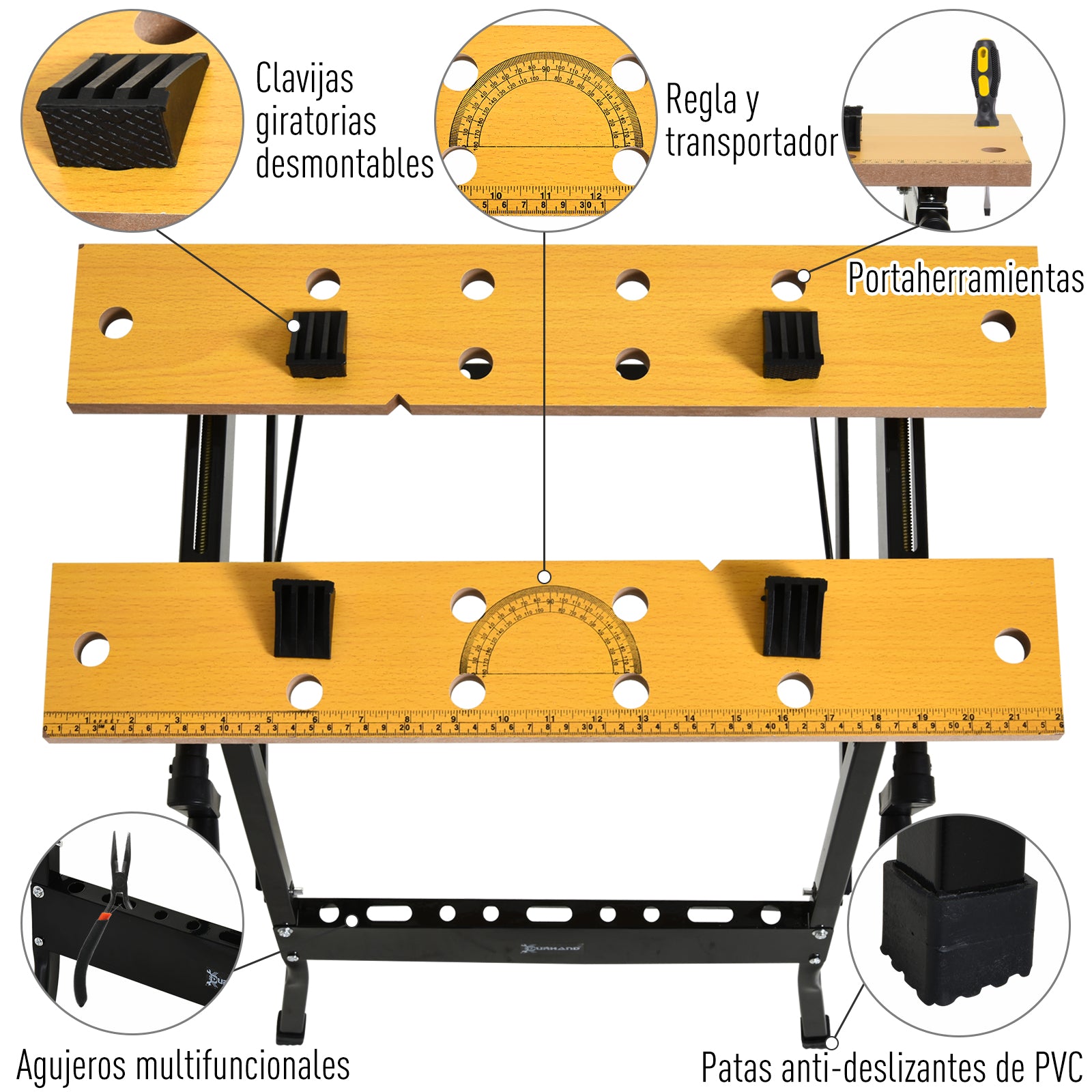- Benefícios: Pode ser convertida em cavalete para serrar em segundos, possui 4 grampos fortes, furos para ferramentas e pés antiderrapantes em PVC.