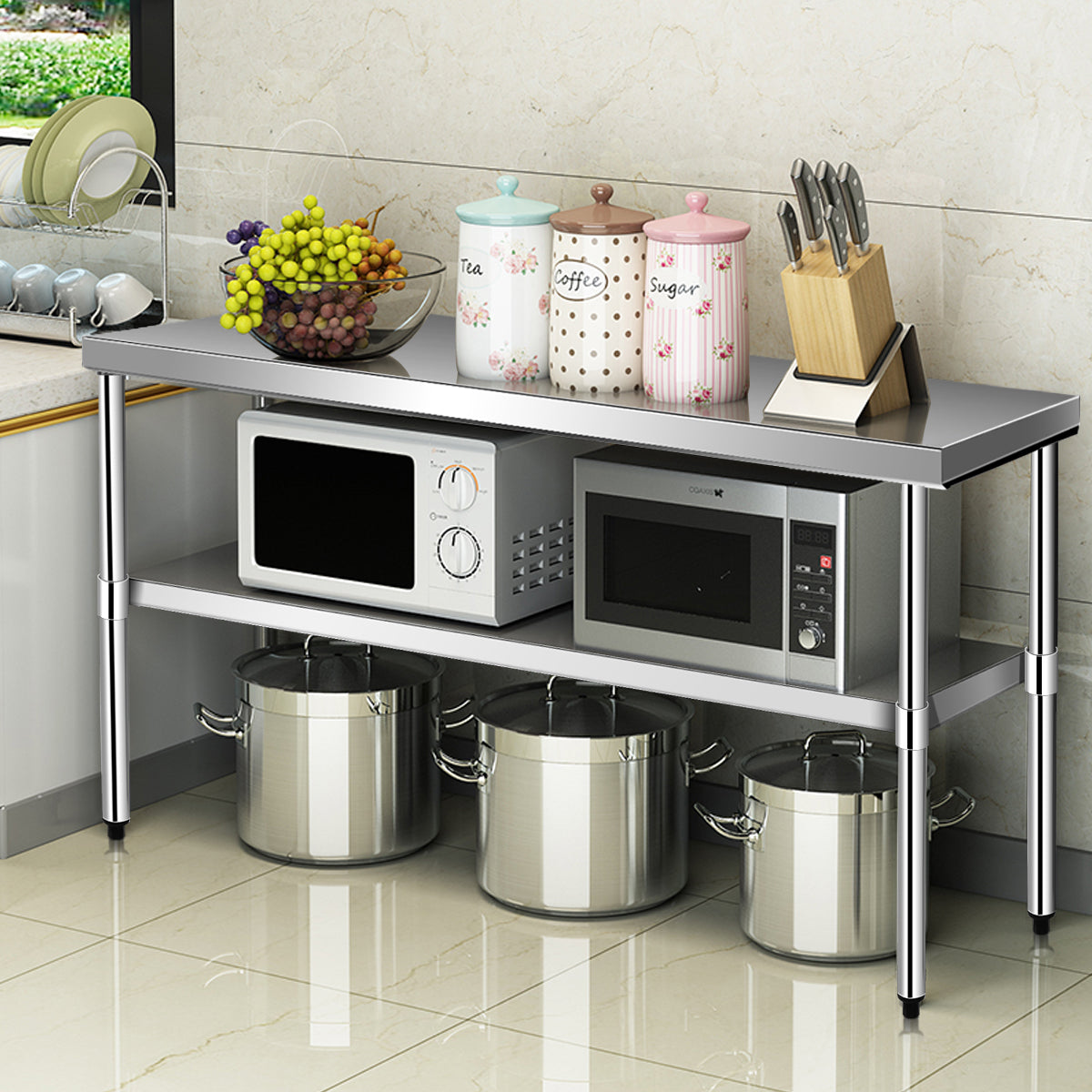Esta mesa de metal é feita de aço inoxidável polido, resistente à corrosão e sujidade. Fácil de limpar com um pano húmido. Um item essencial em cozinhas, bares, cafés, escolas e restaurantes. Com uma ampla superfície e duas prateleiras, satisfaz as necessidades diárias. O material em aço inoxidável é robusto e estável, permitindo-lhe colocar o que desejar.