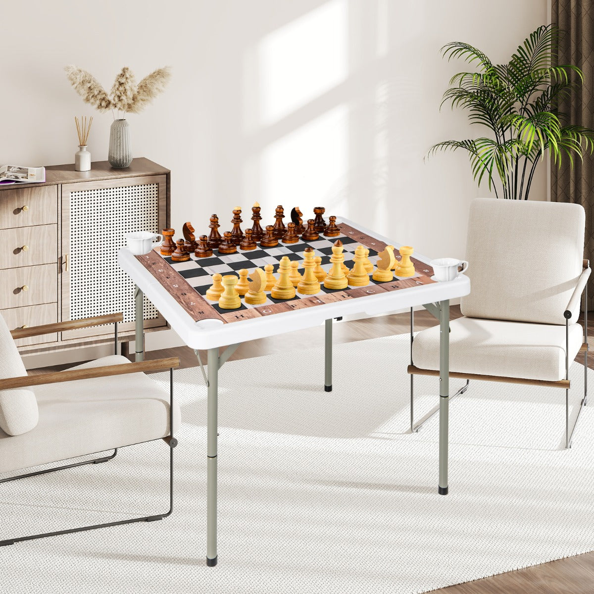 Com um mecanismo de dobragem rápida e uma pega de transporte incorporada, a mesa quadrada dobrável garante uma arrumação e transporte sem complicações. Construída com um tampo espesso de HDPE e pernas de metal resistentes, a mesa de cartas oferece um desempenho fiável. O seu tapete com base de borracha antiderrapante reduz o ruído durante a utilização, enquanto os 4 suportes para copos integrados mantêm as bebidas seguras e ao alcance. Não é apenas para xadrez, basta remover o tapete para transformá-la numa mesa multiusos, adequada para cartas, puzzles, mahjong e muito mais, sendo perfeita para festas, piqueniques e noites de jogos.