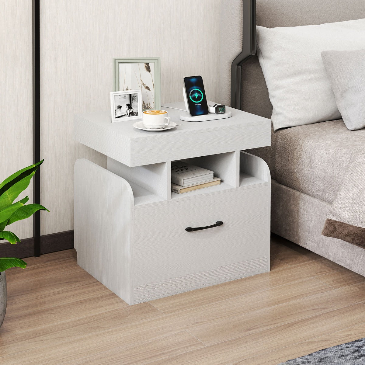 - Estação de Carregamento Incorporada: A nossa mesinha de cabeceira vem com uma estação de carregamento para que possa carregar os seus dispositivos eletrónicos de forma rápida e segura. No total, possui 2 tomadas, 1 porta USB e 1 porta Tipo-C, que mantêm os seus múltiplos dispositivos carregados a todo o momento.