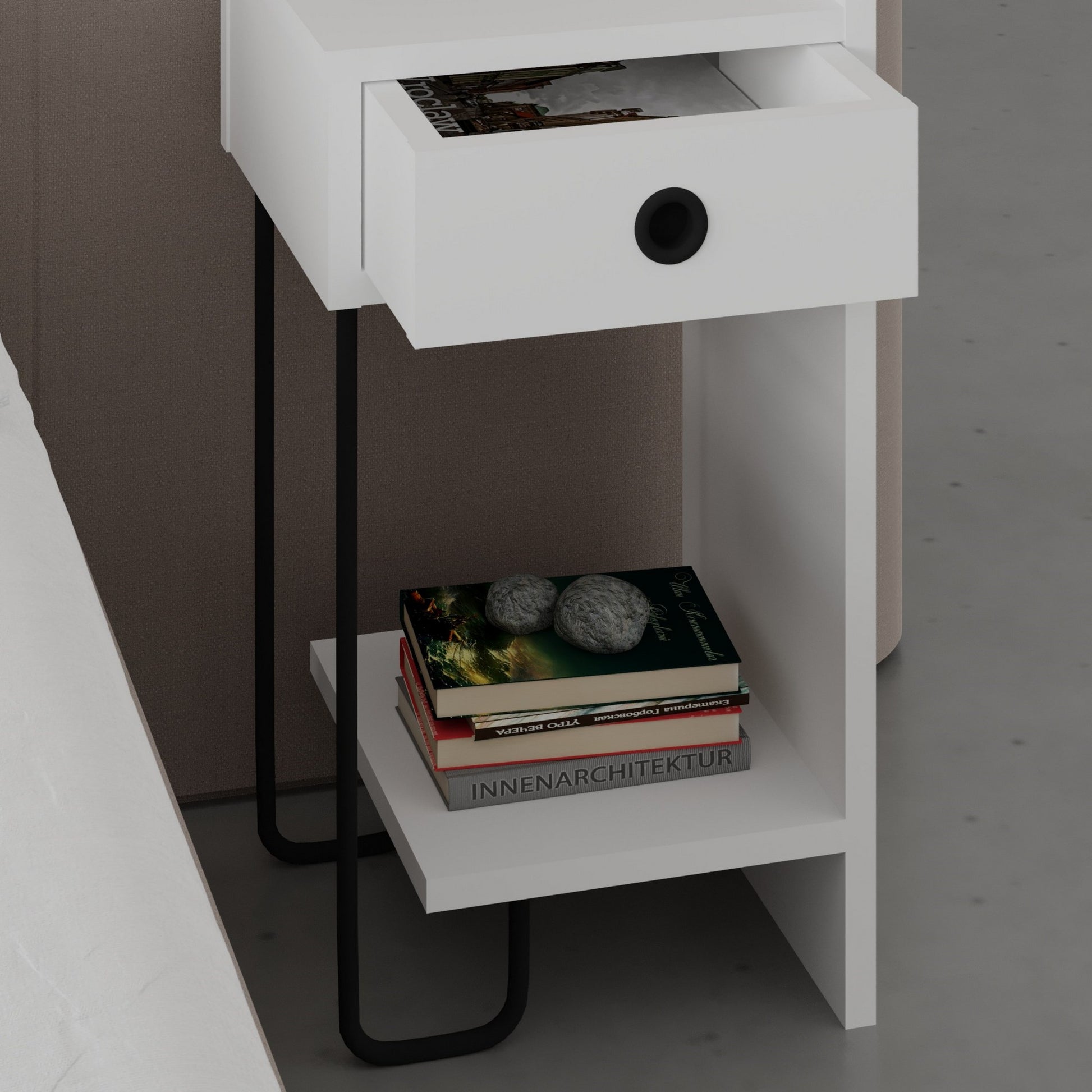 Fabricada com o máximo cuidado e atenção aos pormenores, a nossa mesa de cabeceira foi concebida para melhorar o ambiente do seu quarto. O seu design elegante e moderno combina facilmente com qualquer decoração, acrescentando um toque de sofisticação ao seu espaço. A cor branca pura transmite uma sensação de tranquilidade e pureza, criando uma atmosfera serena para uma noite de sono tranquila.