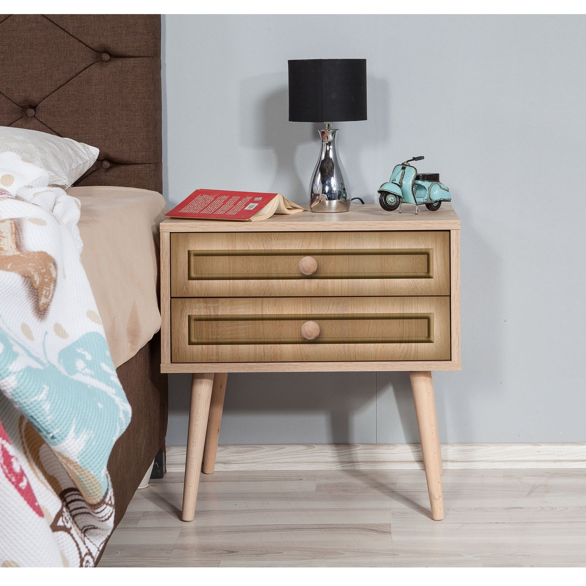 Com duas gavetas espaçosas, a nossa mesa de cabeceira oferece uma ampla arrumação para todos os seus objectos essenciais. A altura da gaveta de 13 cm permite-lhe organizar os seus pertences, mantendo o seu quarto livre de desordem. A altura das pernas de 30 cm dá um toque arejado ao seu espaço.