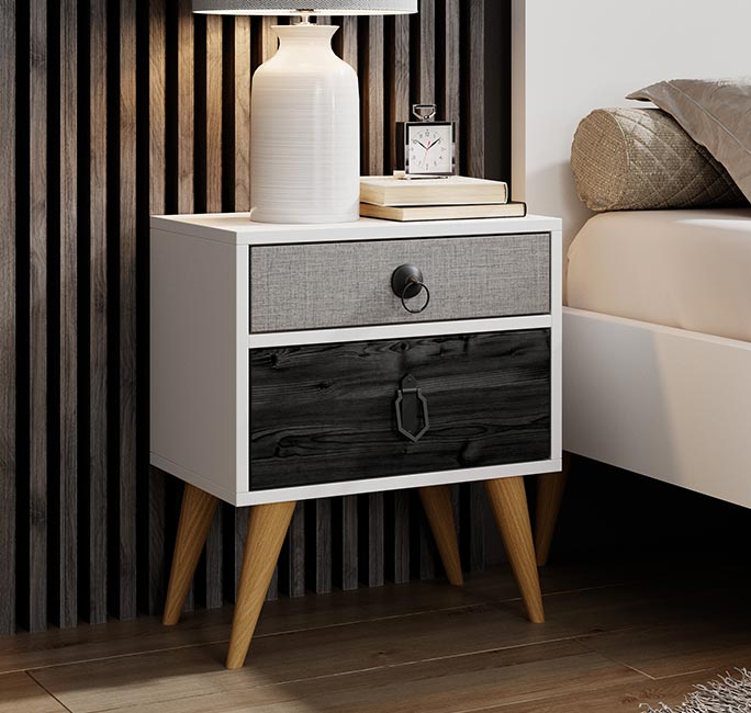 Agora podes desfrutar desta mesinha de cabeceira de design intemporal e muito original. A estrutura branca cria uma sensação de luminosidade, enquanto as gavetas em tons de cinza e wengué adicionam um grande contraste. As pernas cónicas inclinadas em madeira clara não só proporcionam estabilidade, mas também conferem um visual elegante num estilo escandinavo muito atual. Uma combinação de cores neutras que se adapta a qualquer estilo de decoração. Os puxadores metálicos de design original, diferentes entre si, acrescentam um toque extra de distinção. Possui dois gavetões de diferentes tamanhos para teres à mão os teus objetos essenciais no teu quarto. Não percas a oportunidade de adquirir um par destas mesinhas de cabeceira e dar um novo estilo à tua área de descanso. Materiais da mesinha: Estrutura em aglomerado de 18 mm de espessura. Frentes das gavetas fabricadas em aglomerado de 18 mm de espessura. Guias metálicas não removíveis. Puxadores metálicos. Medidas da mesinha de cabeceira: Largura: 45 cm. Altura: 52,5 cm. Profundidade: 29,5 cm. O móvel vem com instruções e parafusos.