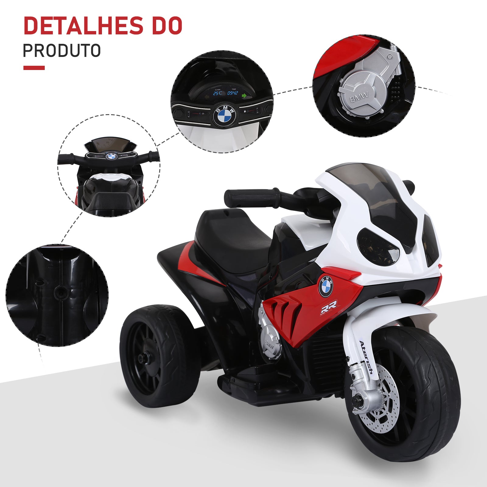 - Especificações: Motor de 6V, bateria de 6V, 4 AH. Certificações EN71-1.2.3, EMC, EN62115, CE e RoHS.