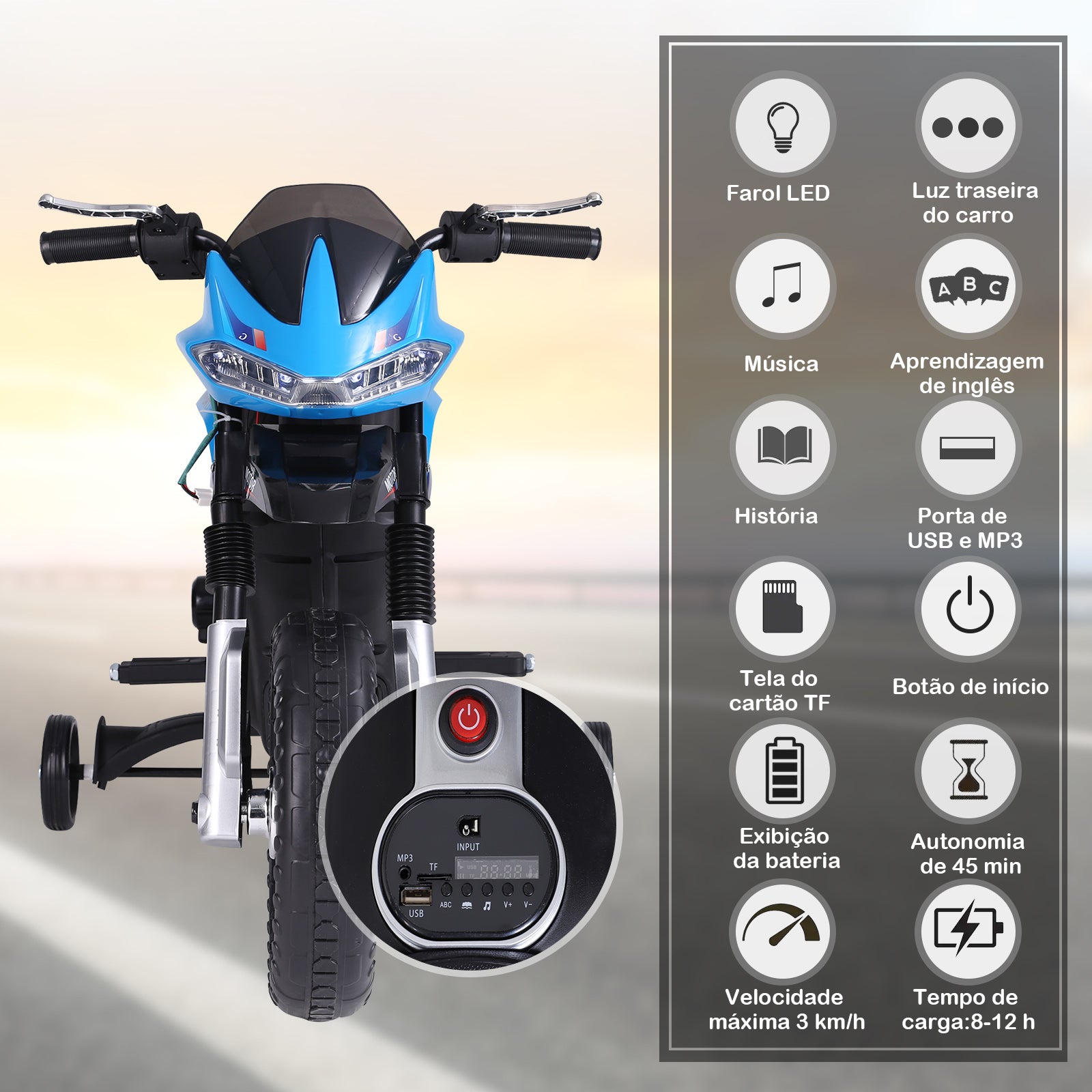 A motocicleta elétrica azul é equipada com rodas de plástico antiderrapantes, 2 rodas de apoio para maior segurança, suspensão dupla para uma condução suave e confortável, e indicador de carga da bateria. Inclui manual de instruções e é ideal para crianças que adoram aventuras sobre rodas!