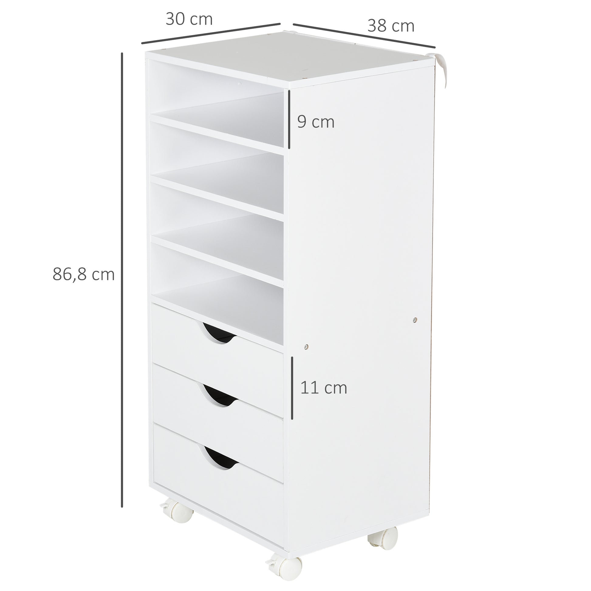 Móvel Auxiliar de Escritório com 3 Gavetas e 4 Prateleiras - 40x30x83 cm - Branco