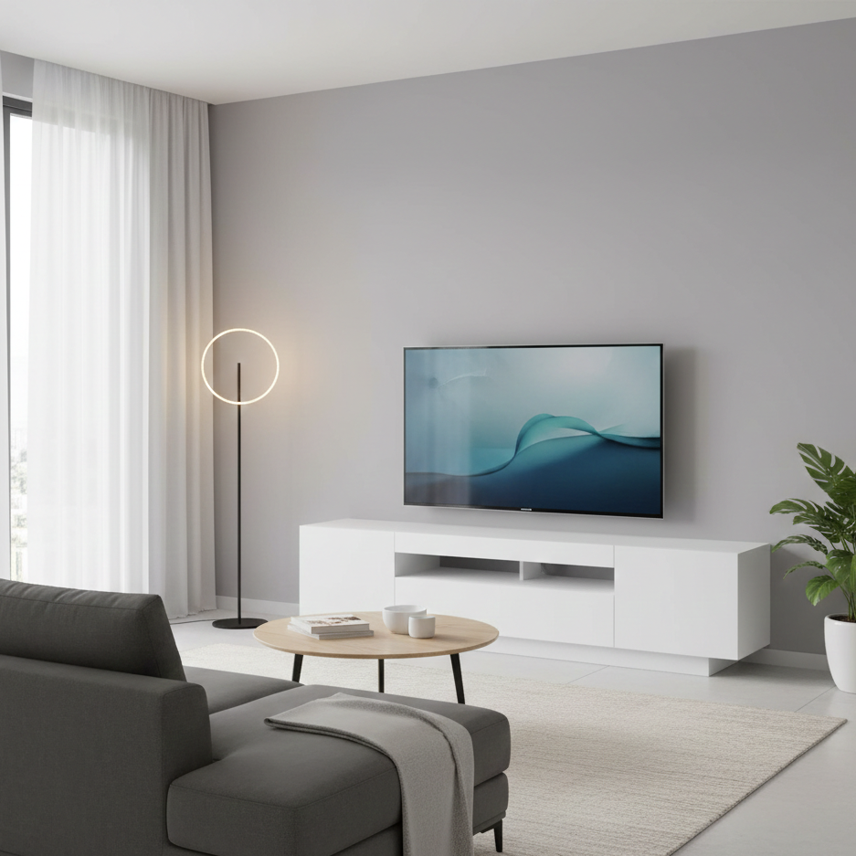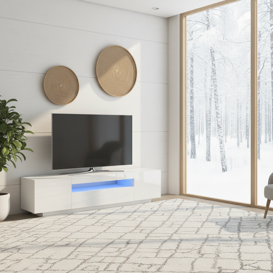 Com um design moderno e prático, este móvel de TV com luzes LED torna-se definitivamente um ponto focal na sua divisão. A construção sólida deste armário de HiFi torna-o altamente durável. Dispõe de um amplo espaço para manter o seu leitor de DVDs, consola de jogos, dispositivo de transmissão e suportes de multimédia devidamente organizados. Este armário de TV apresenta luzes RGB LED, que possuem menus diferentes para mudar a cor das luzes e deixar que elas se ajustem automaticamente de forma diferente. As luzes LED destacam o aspeto moderno e contribuem para uma aparência elegante. Esta unidade de TV é fácil de limpar com um pano húmido.