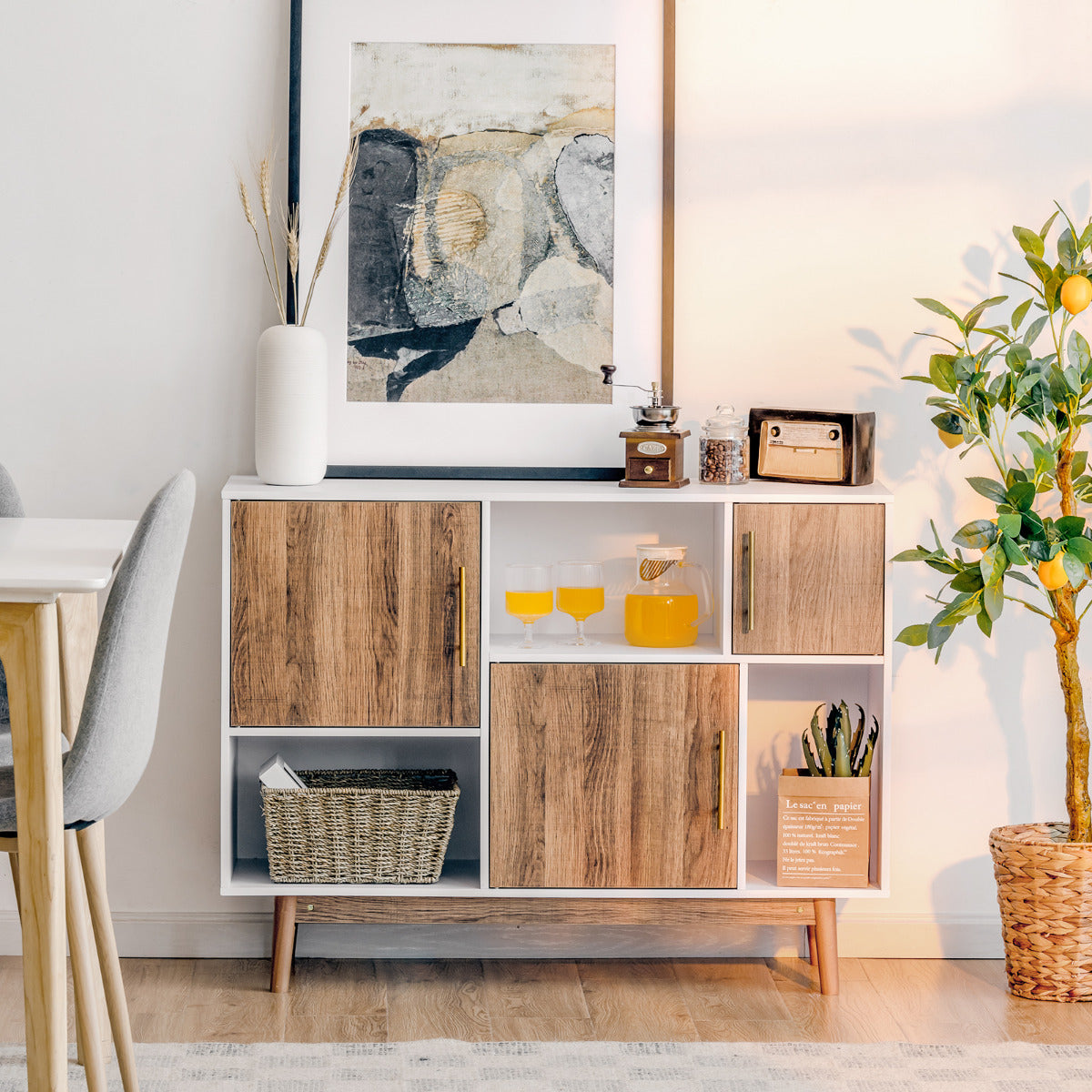 O nosso móvel de despensa é moderno e versátil, adaptando-se às tuas necessidades! Ideal para colocar na sala, quarto, cozinha e escritório, ajuda a organizar o espaço. Não é apenas um armário, mas também pode ser um móvel de TV. Os 6 compartimentos com formas e tamanhos diferentes são versáteis para expor tudo o que desejas. Além disso, o seu design irregular e moderno adapta-se a vários estilos decorativos, adicionando elegância onde quer que esteja.