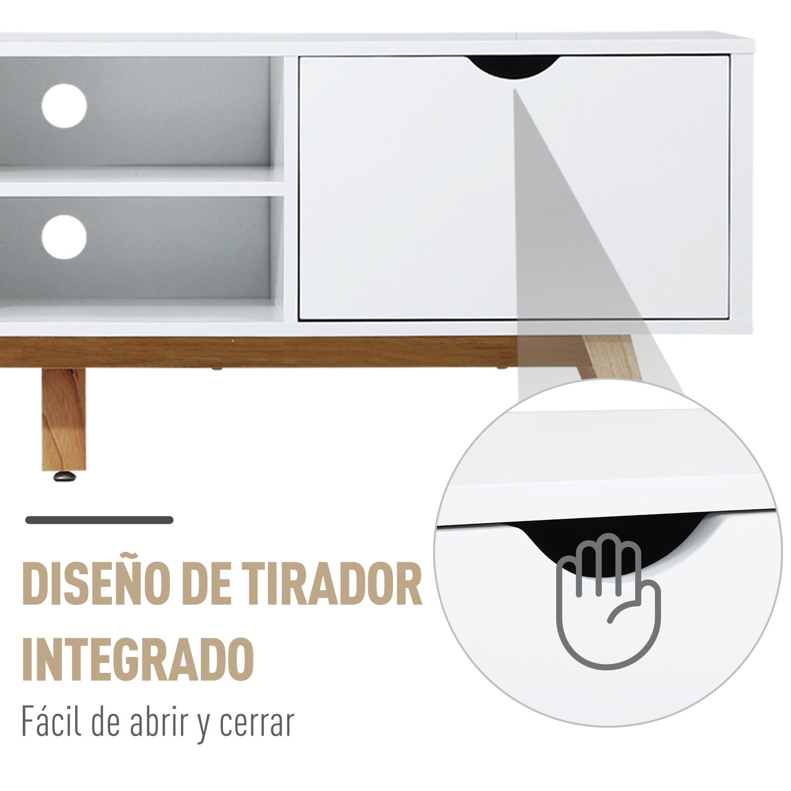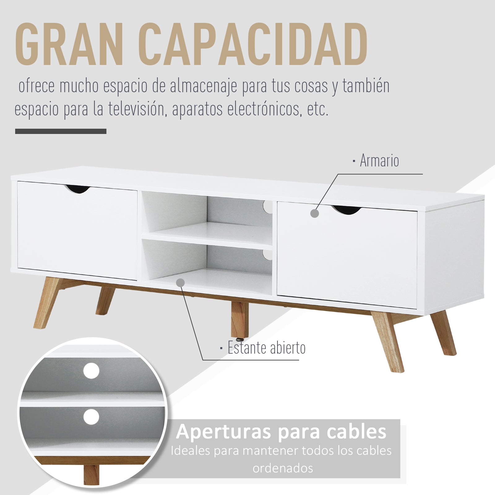 Modernize a sua sala de estar com o Móvel de TV Minimalista em branco e madeira, perfeito para televisores de até 65 polegadas.