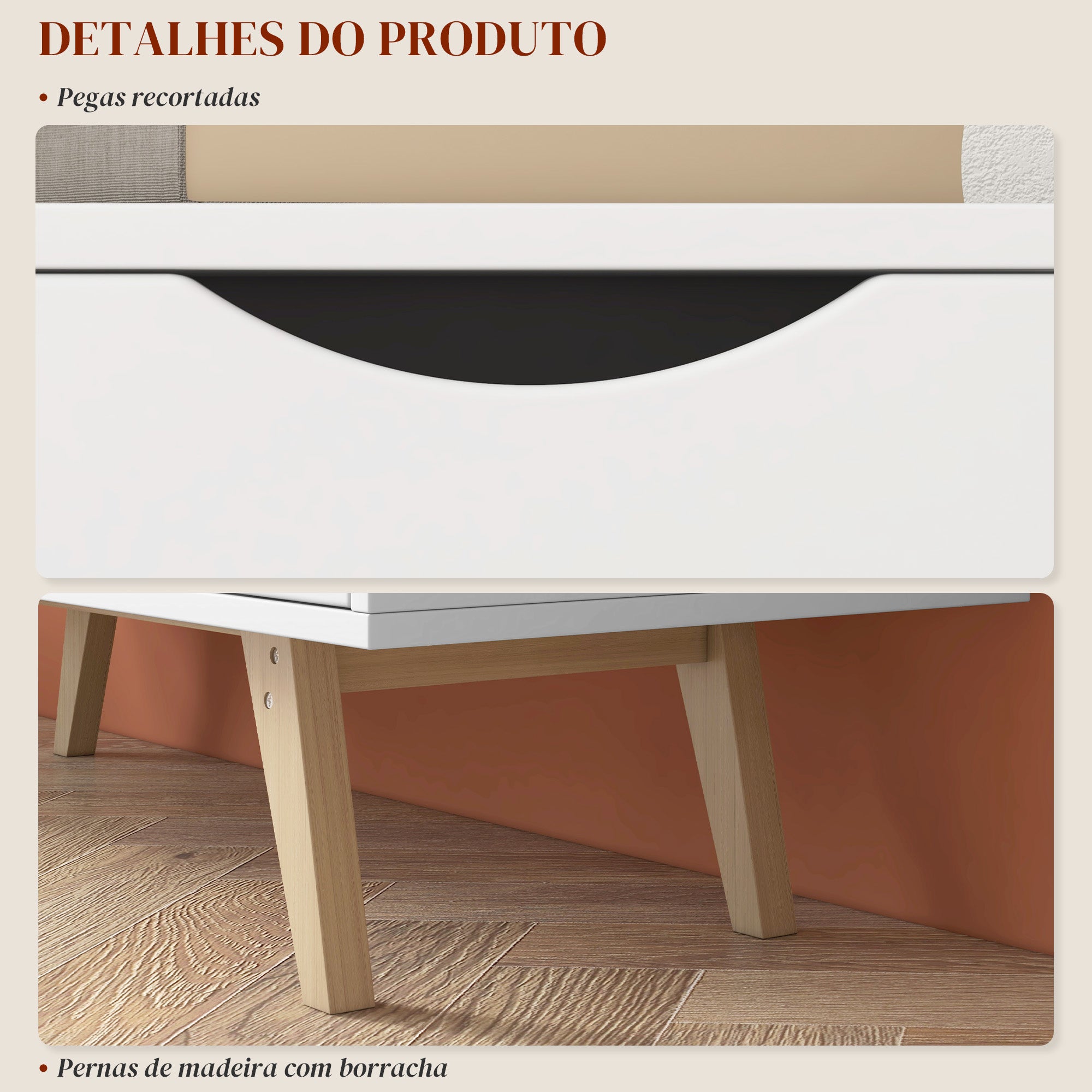 - Materiais: Painel de partículas, MDF e pés de madeira de borracha