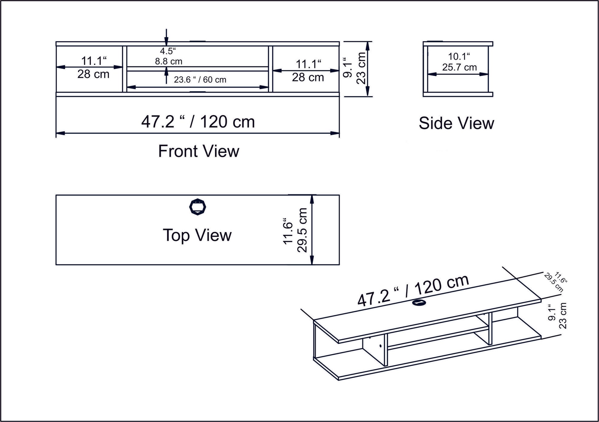 - Tamanho do suporte para TV: Largura: 120cm, Altura: 23cm, Profundidade: 29. 5cm