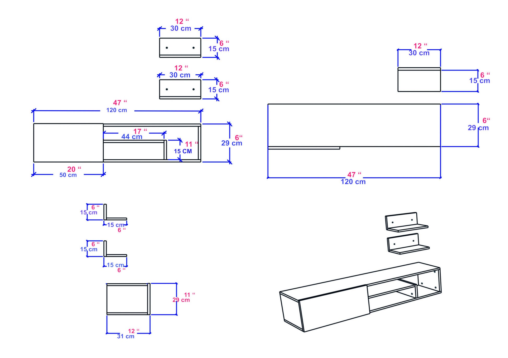 - Tamanho da unidade de TV: Largura: 120 cm, Altura: 29. 3 cm, profundidade: 29. 6 cm