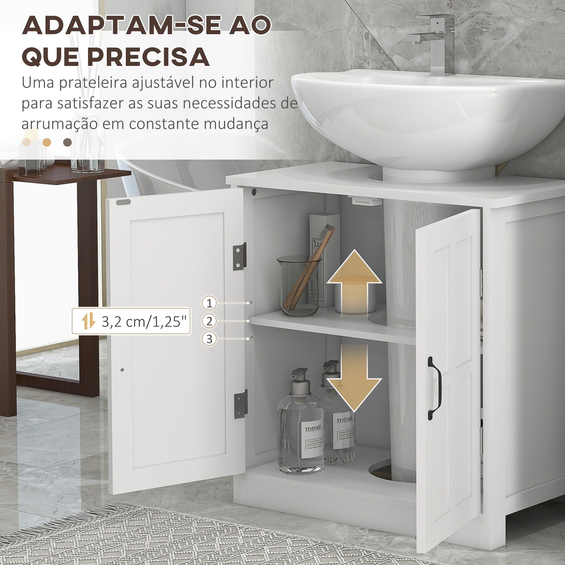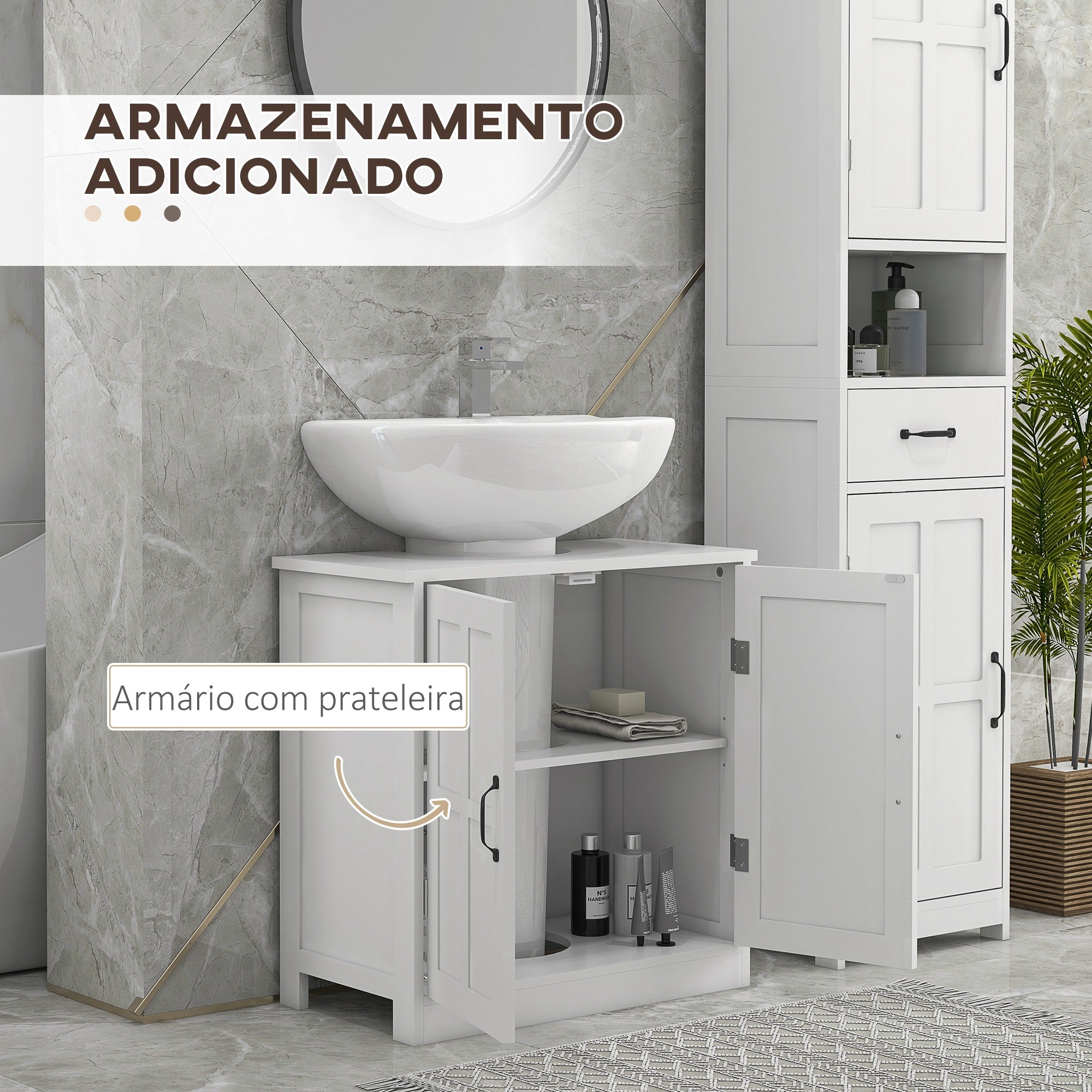- Benefícios: Armazenamento adicional com dupla porta e prateleira interior ajustável em 3 posições de altura