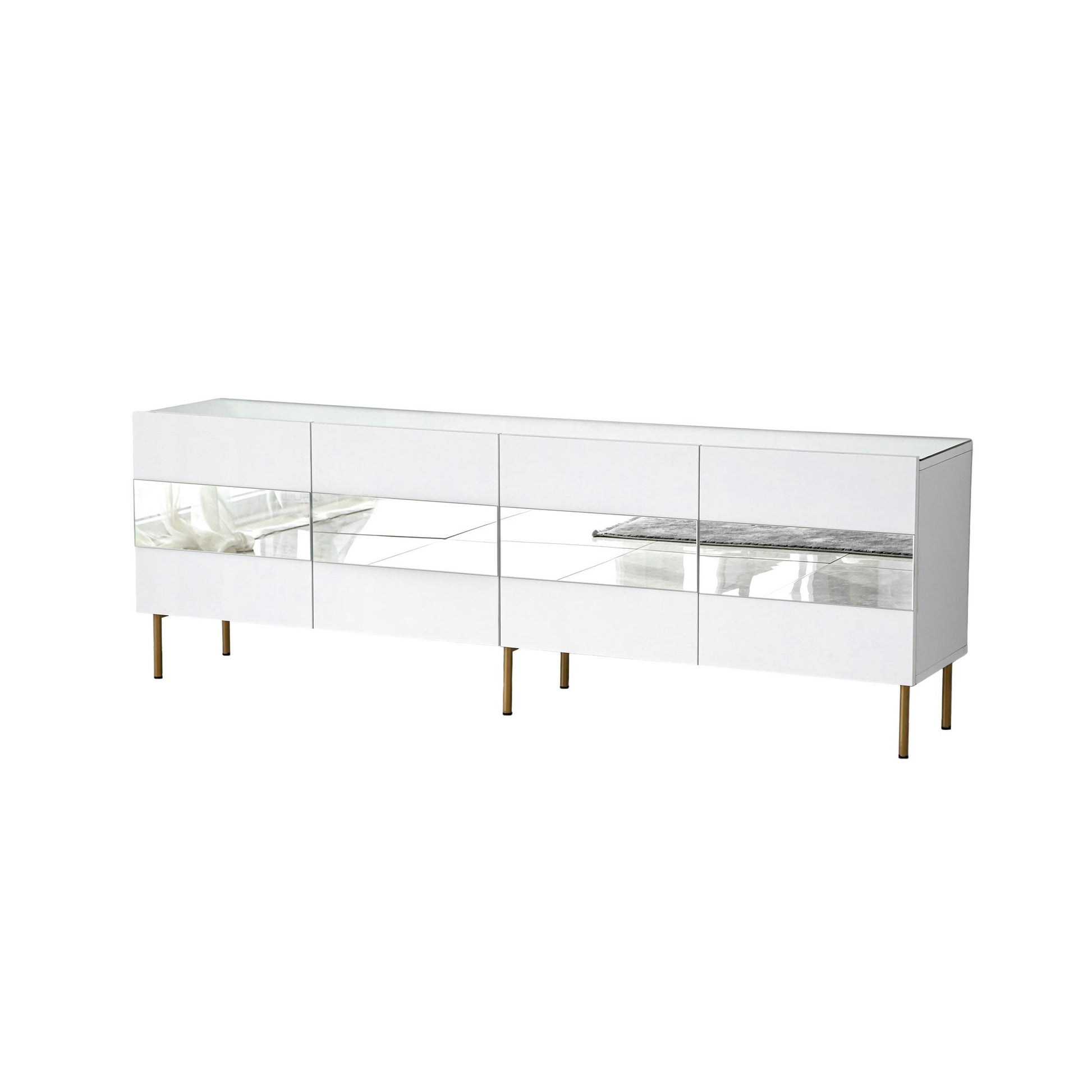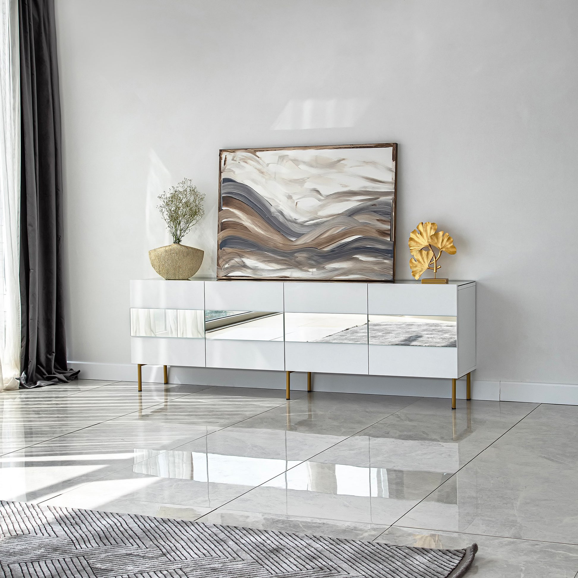 Transforme a sua sala de estar num refúgio de luxo com o nosso requintado móvel para televisão branco e dourado. Esta deslumbrante peça de mobiliário foi concebida para dar um toque de elegância e sofisticação à decoração da sua casa.