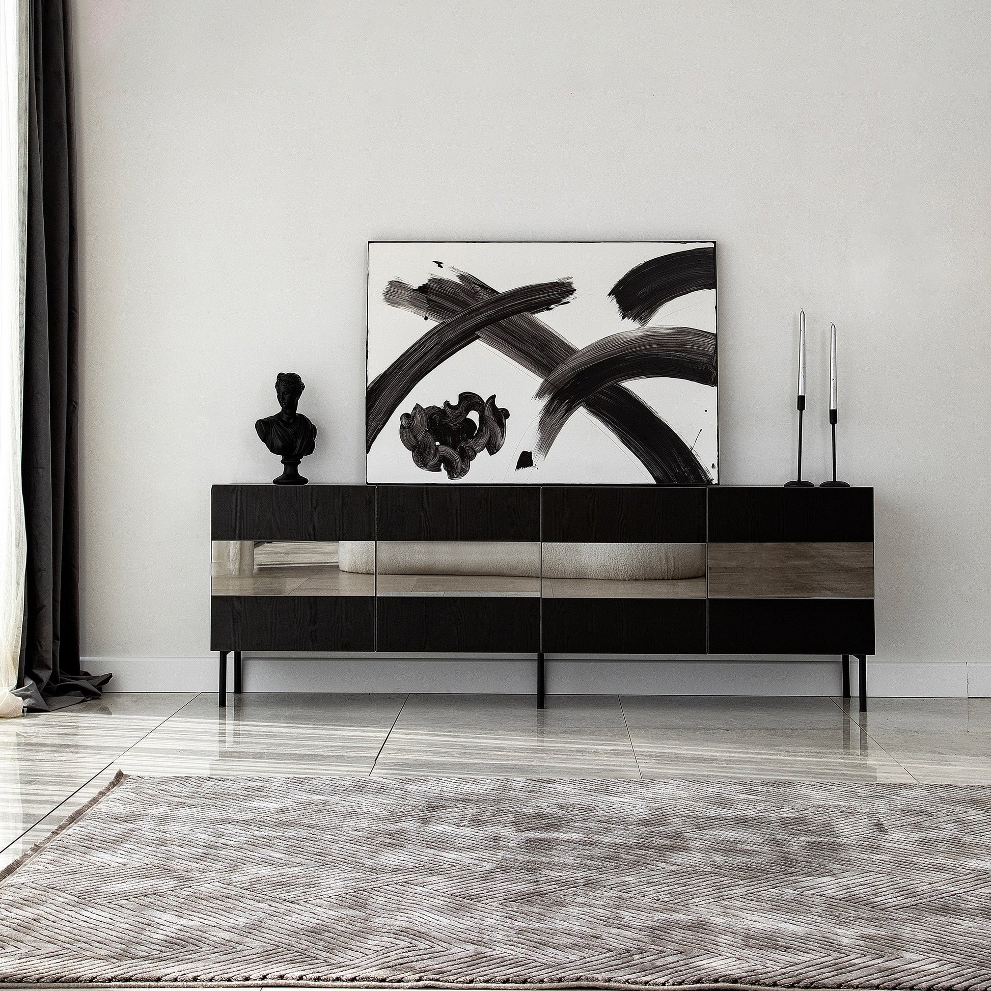 Móvel de TV elegante, preto e fumê, 180 x 59 x 35 cm | Painel de partículas 100% revestido em melamina, 18 mm de espessura | Design moderno para salas de estar e espaços de entretenimento