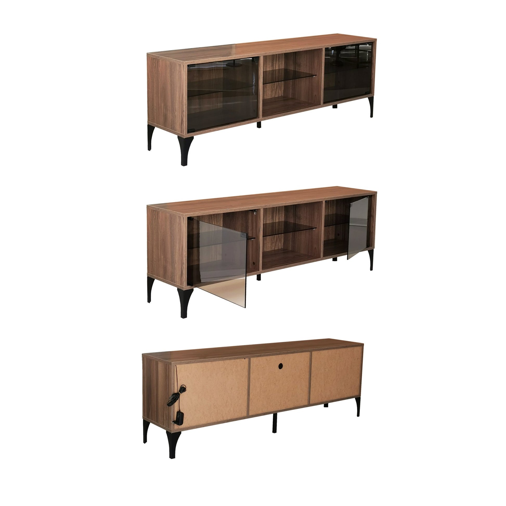 Móvel de TV moderno com iluminação LED e controle remoto, cor nogueira, 160 x 55 x 35 cm | 100% vidro temperado e painel de partículas revestido de melamina, 18 mm de espessura
