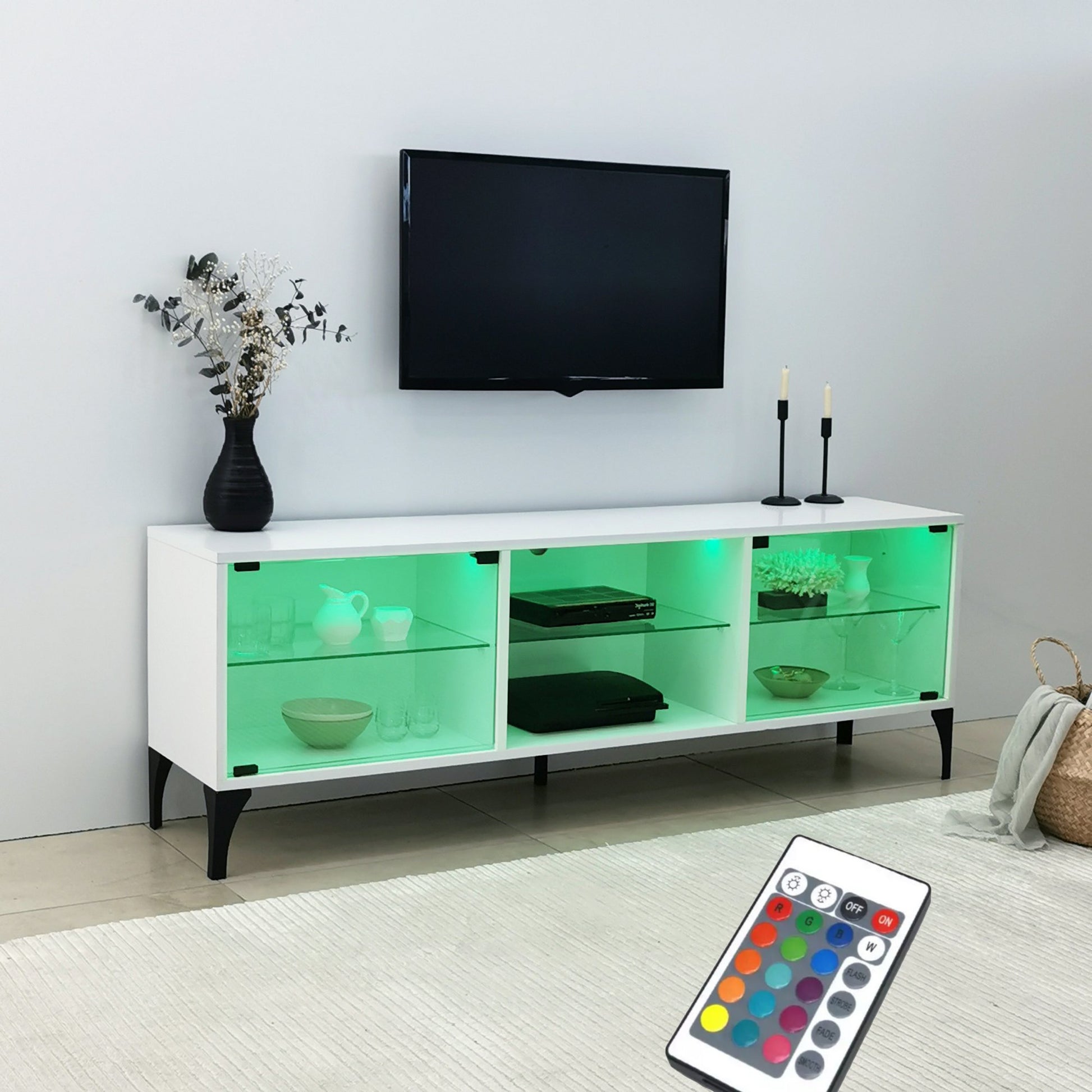 Móvel de TV moderno com iluminação LED e controle remoto, branco, 160 x 55 x 35 cm | 100% vidro temperado e painel de partículas revestido de melamina, 18 mm de espessura