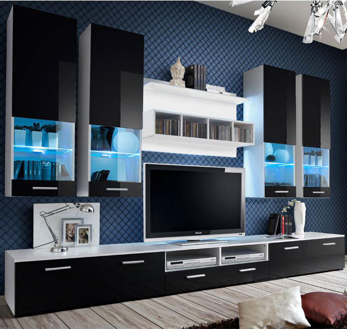 Características do Móvel de Sala: Móvel de sala com design moderno e elegante. Transforme a sua sala com um design de qualidade a um preço acessível. Materiais do Móvel de Sala: Frentes do móvel em MDF lacado brilhante de 16mm. Medidas do móvel: 300 x 194 x 45,6 cm. Vitrines com luzes LED incluídas. Dimensões do Móvel de Sala: Composto por: 3 móveis baixos de 100x36,5x45,6cm, 4 móveis suspensos de 40x120x30cm, 1 prateleira de 100x60x25cm. Este móvel é entregue desmontado em cinco caixas.