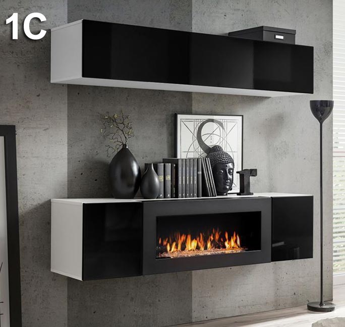 - 2. Armário suspenso com lareira modelo Krista lumbre: Interior com dois compartimentos de igual capacidade. Dimensões: 160cm de comprimento, 40cm de altura, 40cm de profundidade. Duas portas: 32 x 37 x 36,5 cm. Lareira exterior: 90 x 40 x 40 cm. Lareira interior: 74 x 24 x 11,5 cm. O bioetanol e as pedras não estão incluídos.