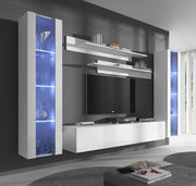 Conjunto de móveis Nerea branco modelo 8, ideal para salões modernos e funcionais. Os módulos individuais permitem personalizar a disposição. Inclui móvel TV, vitrinas e estantes em melamina e MDF. Com portas arredondadas, sistema push-click e luzes LED azuis.