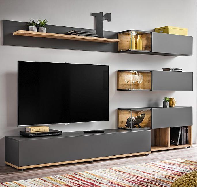 Móvel de sala de linhas retas cor antracite e carvalho com uma parte em vidro e luzes LED, ideal para realçar os teus objetos especiais. Este elegante móvel será o destaque da tua sala.