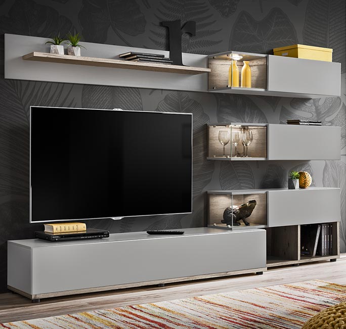 Móvel de sala de linhas retas em cinza pérola e trufa, com parte em vidro e luzes LED para realçar os teus objetos mais especiais. Este elegante móvel será o destaque da tua sala.