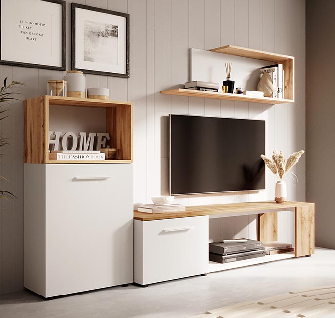Móvel de sala moderno composto por móvel de TV de design original, um móvel alto e uma estante semiaberta a condizer. Destaca-se pela combinação de cores neutras em mate e carvalho, ideal para ambientes modernos e funcionais.