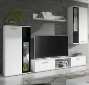 Obtenha um móvel de sala de design, original e elegante. Os painéis frontais são feitos em MDF mate e, nas vitrinas, as portas combinam com vidro preto, com uma prateleira de vidro com sistema de iluminação LED no interior. Inclui luzes LED. Dimensões do móvel de sala: Móvel completo: 235cm x 190cm x 30cm; Móvel vitrina de chão: 60cm x 114cm x 30cm; Vitrine suspensa: 60cm x 114cm x 30cm; Móvel de TV: 175cm x 28cm x 30cm; Estante: 102cm x 16cm x 17,5cm. Consulte a imagem.