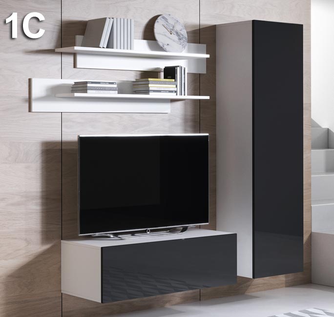 - Modelo 1 inclui: 1 móvel de TV Luke H1, 1 armário suspenso Luke V4, 1 conjunto de estantes Luke.