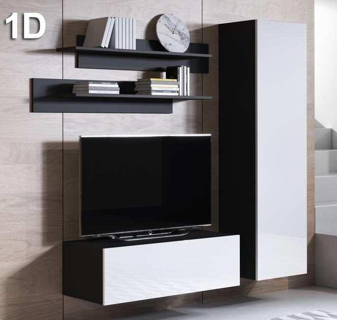 - Modelo 1 inclui: 1 móvel de TV Luke H1, 1 armário suspenso Luke V4, 1 kit de estantes Luke.