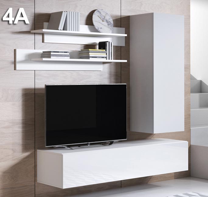 - O modelo 4 inclui: 1 móvel de TV Luke H2, 1 armário suspenso Luke V1, 1 kit de prateleiras Luke.