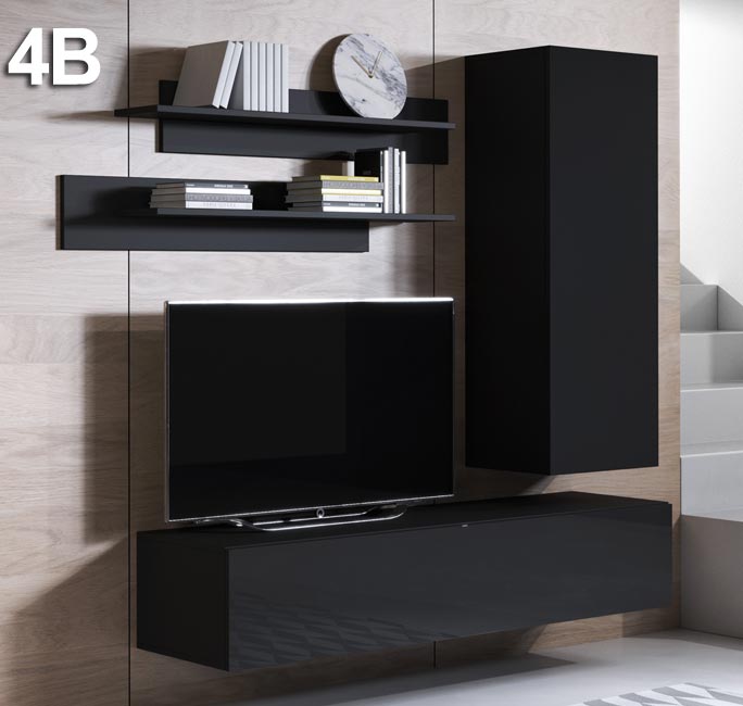 - Modelo 4 inclui: 1 móvel de TV Luke H2, 1 armário suspenso Luke V1, 1 kit de estantes Luke.