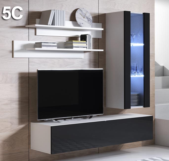 - Modelo 5 inclui: 1 Móvel TV Luke H2, 1 Armário suspenso Luke V2, 1 Kit de estantes Luke.