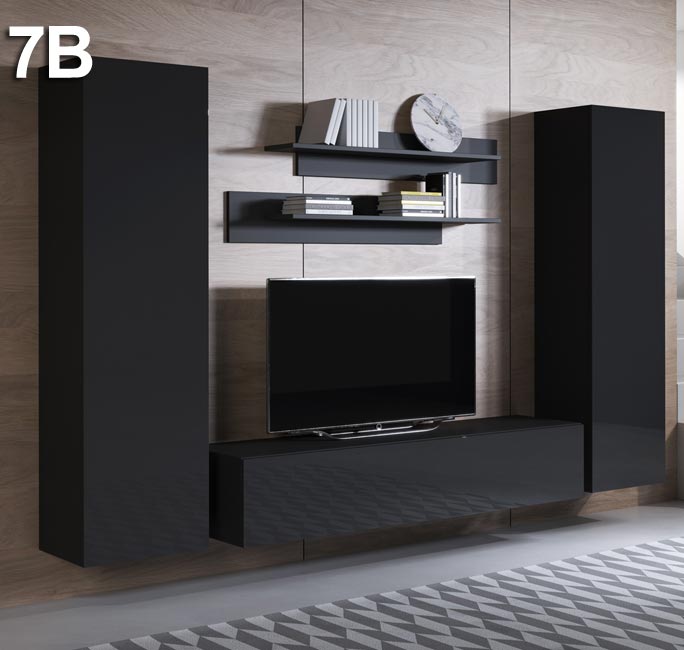 O modelo 7 inclui: 1 móvel de TV Luke H2, 2 armários suspensos Luke V4, 1 kit de estantes Luke.