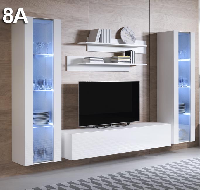 - Modelo 8 inclui: 1 móvel de TV Luke H2, 2 armários suspensos Luke V5, 1 kit de estantes Luke.