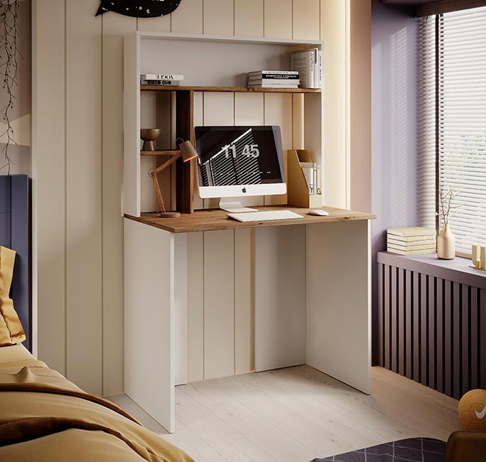 Escritório prático e funcional para espaços reduzidos. Design elegante em branco mate e pinho atlântico, com estante incorporada para organização. Fácil montagem e manutenção.