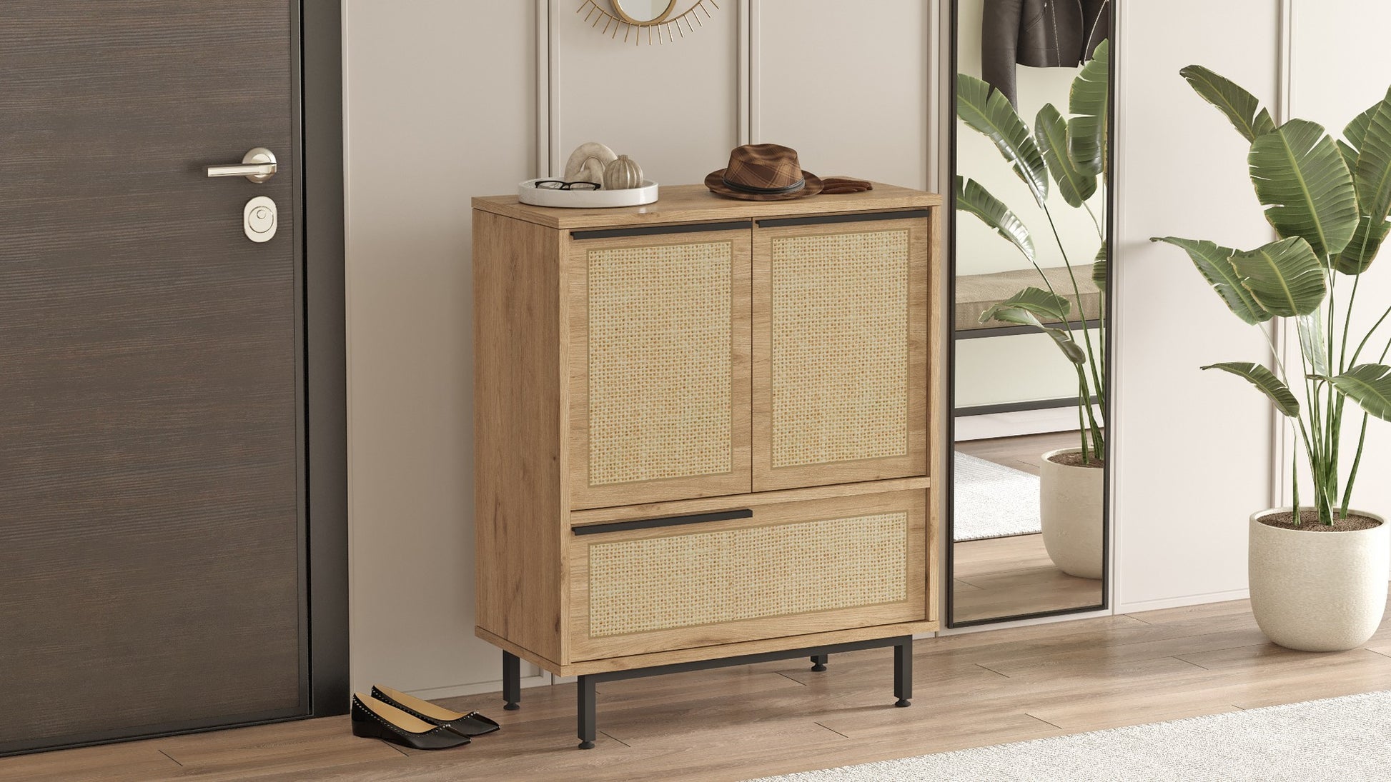 Com o seu design elegante e moderno, a nossa sapateira irá elevar instantaneamente a estética de qualquer divisão. A combinação das cores nogueira e carvalho acrescenta um toque de sofisticação, tornando-a numa adição perfeita à decoração da sua casa. Diga adeus às pilhas de sapatos desarrumados e olá a um espaço elegante e organizado.