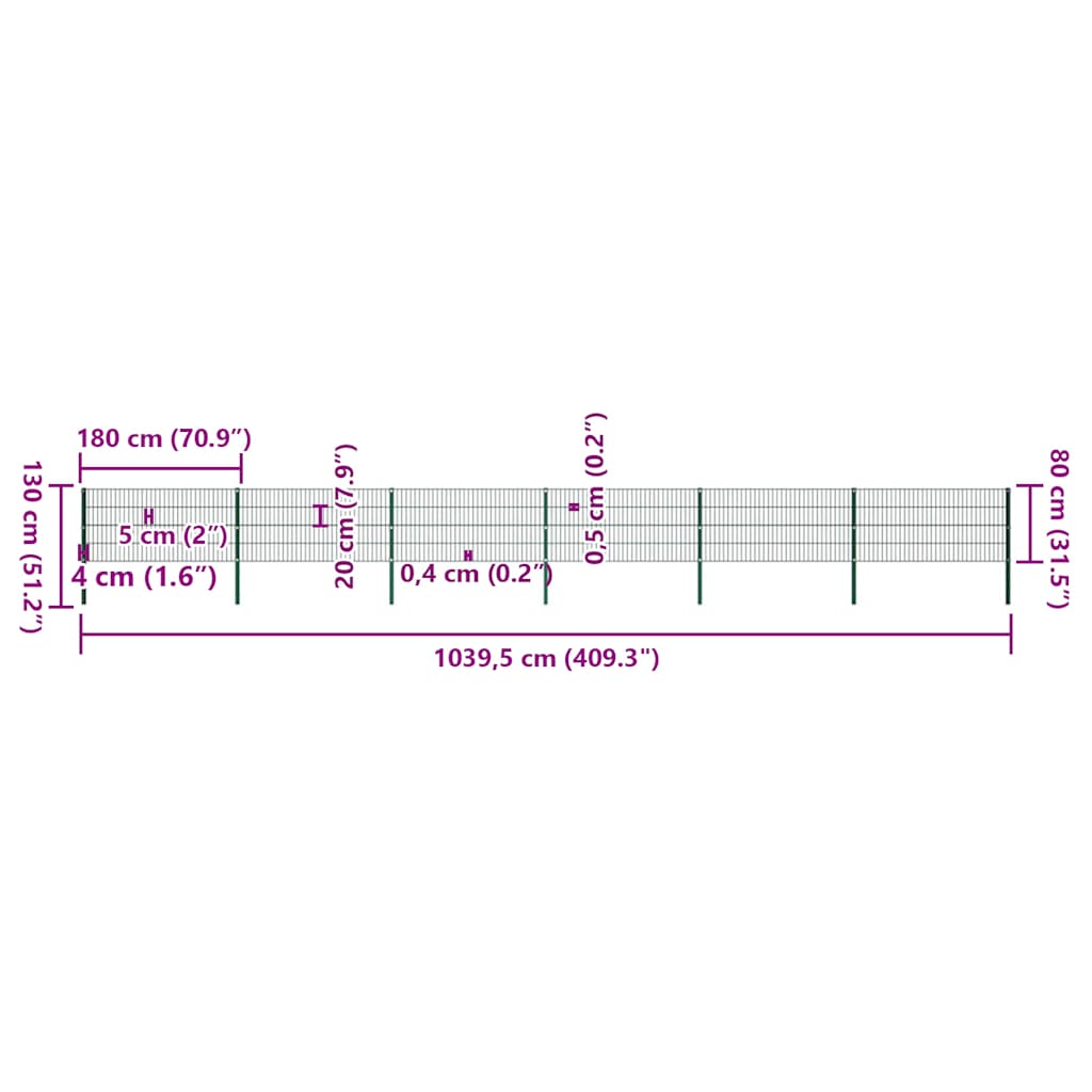 Painel de vedação com postes de ferro 1040x80 cm verde