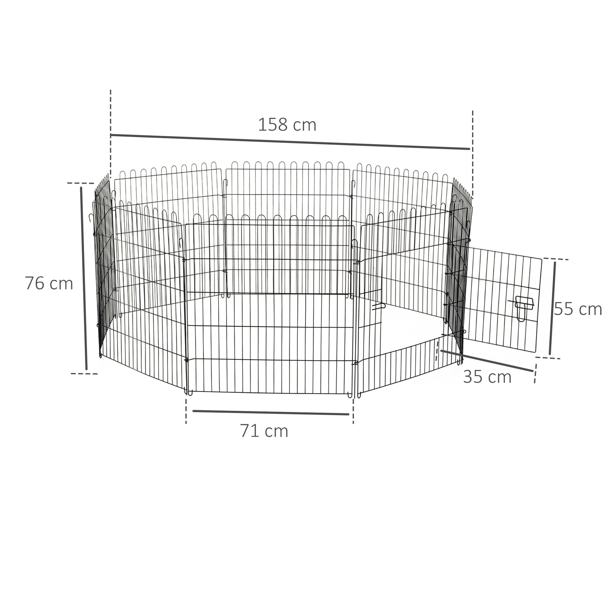 - Medidas: Ø158x76 cm (DxA), cada vedação: 71x76 cm (CxA), porta: 35x55 cm (CxA)
