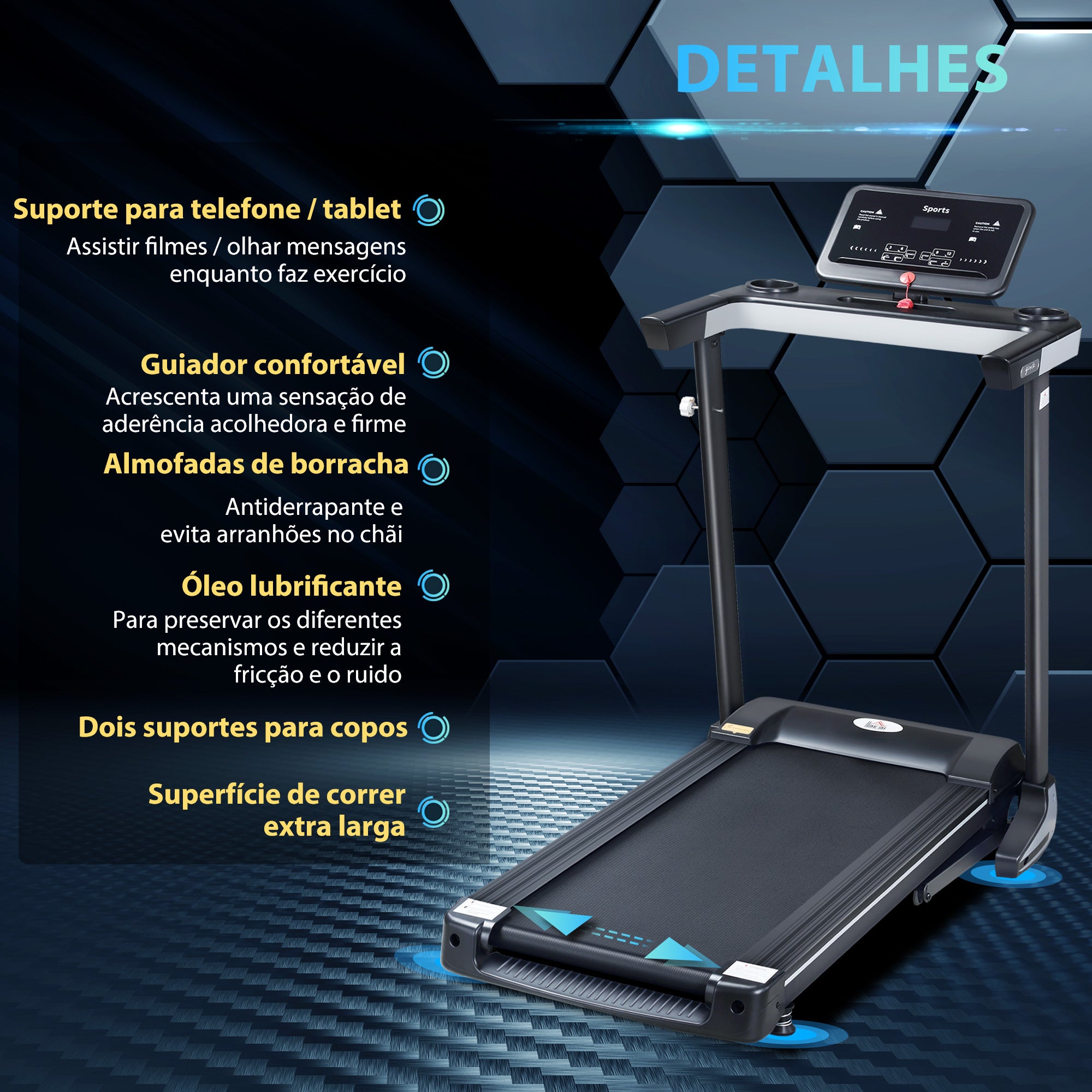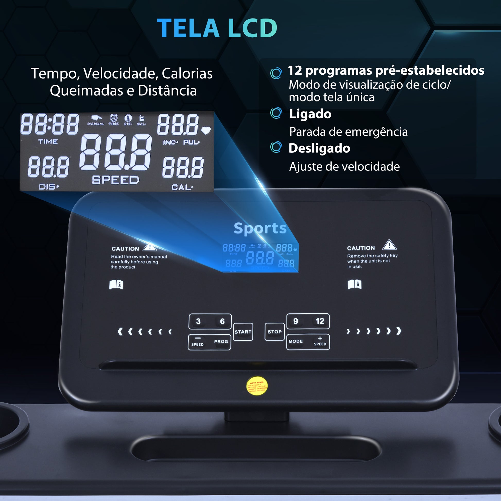 A passadeira possui um design moderno, ecrã LCD para monitorizar o treino, 12 programas predefinidos, botão de segurança e fácil dobragem para guardar em qualquer espaço.