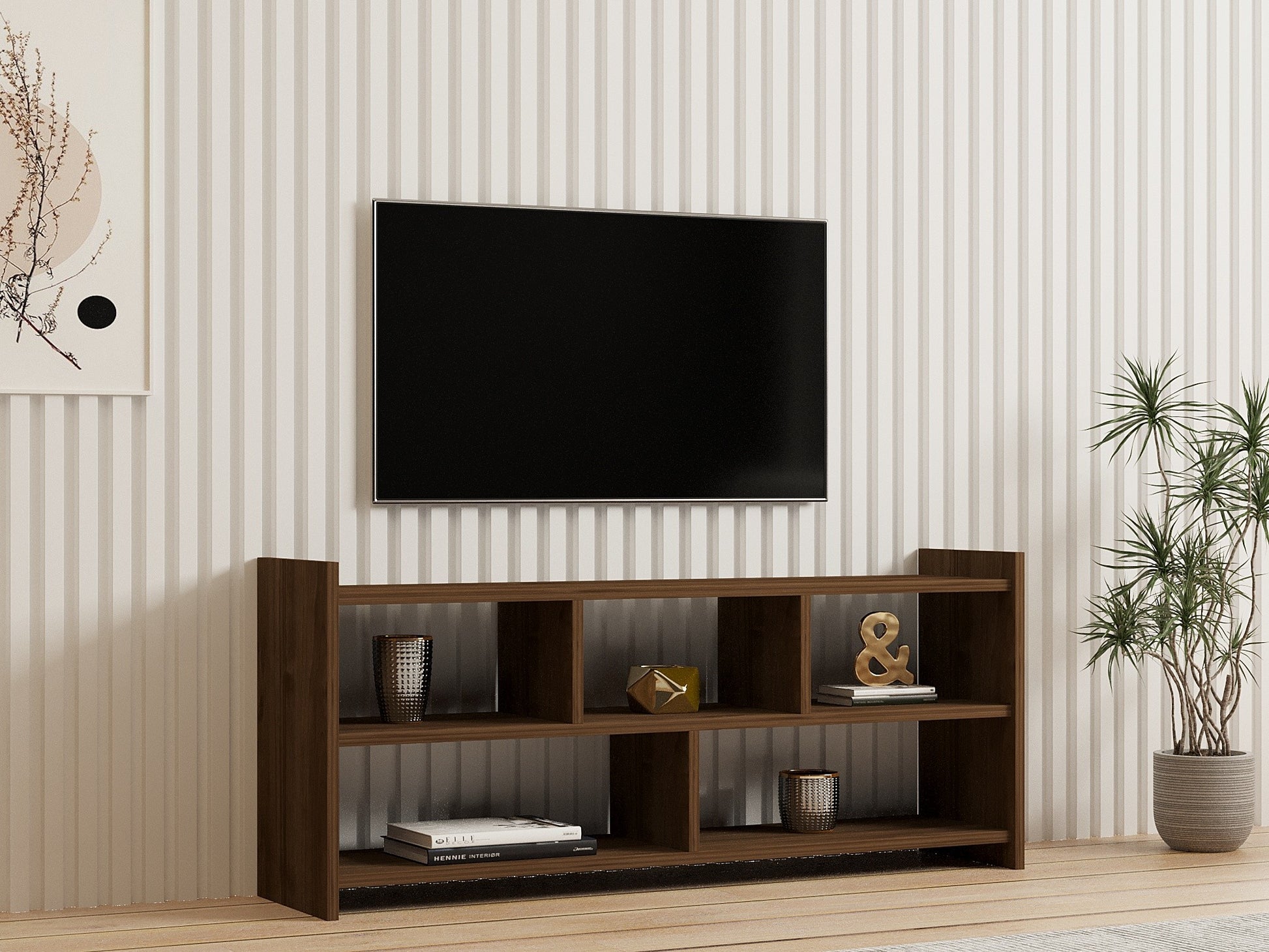 Transforme sua área de entretenimento com este suporte para TV moderno que combina funcionalidade com um design escandinavo minimalista. Suas linhas limpas e a cor quente da Nogueira criam uma atmosfera aconchegante e convidativa, perfeita para noites relaxantes com seus programas e filmes favoritos.
