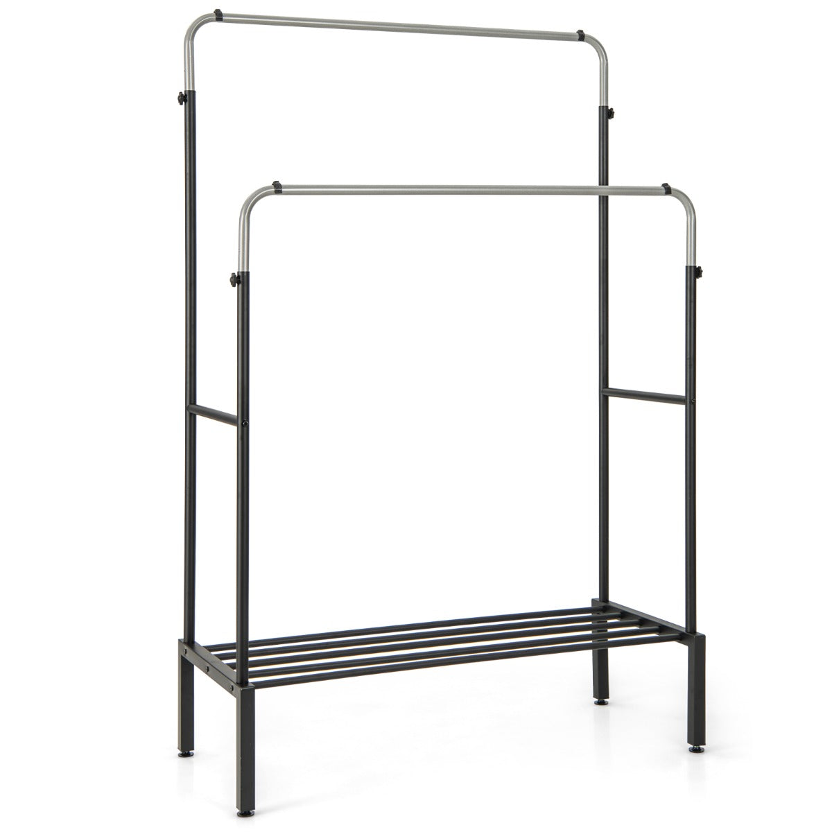 Este perchero de duplo varão será o teu assistente perfeito para guardar a tua roupa! Além das barras com alturas ajustáveis para duplicar a capacidade de pendurar, este perchero também possui 2 barras laterais e um sapateiro, para manter os teus acessórios à mão e exibir a tua coleção de calçado. Na parte inferior do perchero, há ainda um espaço adicional para sapatos, garantindo amplo espaço de armazenamento.