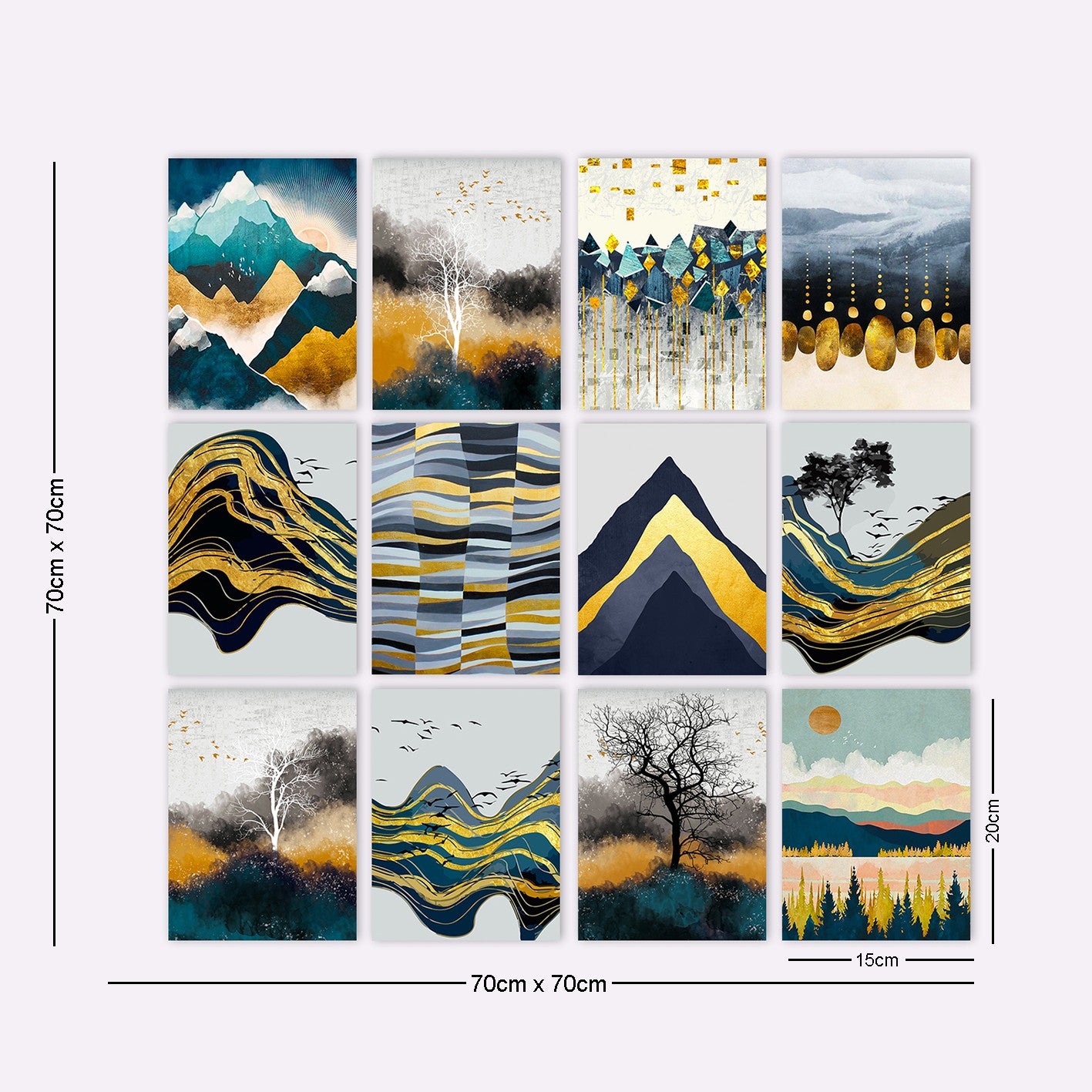 Com estas 12 peças únicas, tem a liberdade de as organizar e expor da forma que desejar. Quer opte por criar um padrão simétrico ou misturar e combinar diferentes designs, estes quadros elevarão sem esforço o ambiente da sua casa ou escritório.