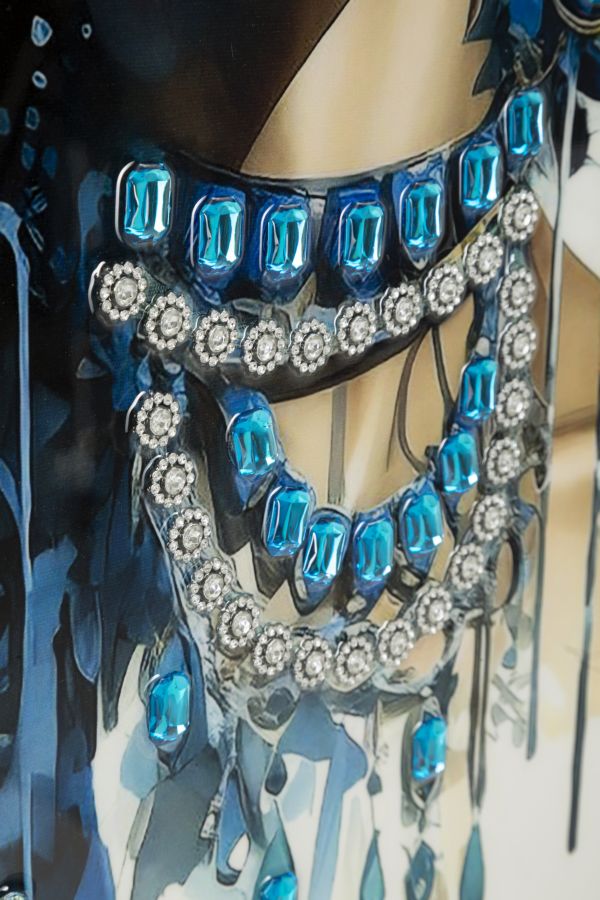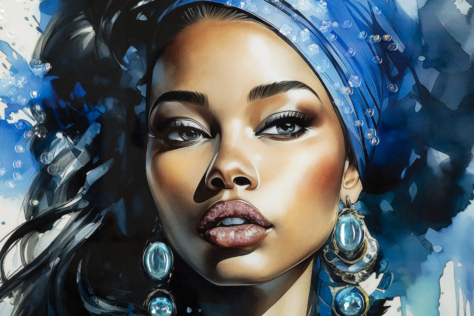 Descubra a elegância e riqueza cultural capturada nesta pintura em tela, onde uma mulher com turbante azul e joias brilhantes exala realeza. Enriquecida com aplicações em relevo, esta obra é um testemunho de design moderno e vibrante. A combinação de moldura de madeira de abeto e metal assegura durabilidade e um acabamento requintado. Perfeito para transformar qualquer espaço, esta peça é uma celebração de arte e sofisticação.