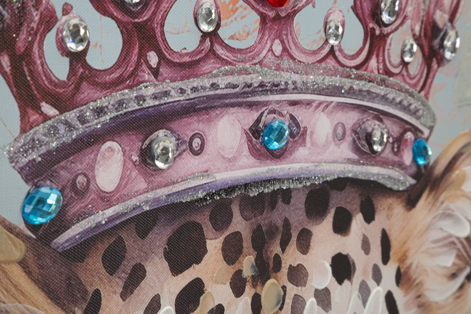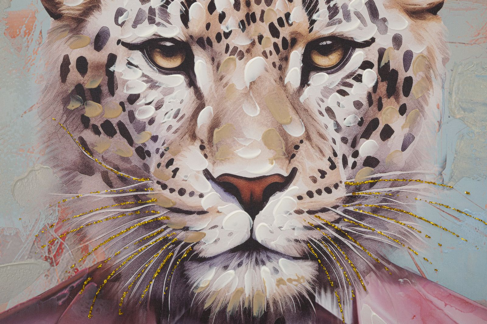 Eleve o seu espaço com esta deslumbrante pintura em tela, em tons de rosa, adornada com uma moldura metálica dourada e estrutura em madeira. Apresentando um leopardo com coroa de rei, este design elegante e régio é ideal para enriquecer qualquer ambiente com um toque de majestade. As aplicações em relevo conferem profundidade e sofisticação à peça, destacando-se pela sua qualidade excecional e acabamento requintado. Transforme a sua decoração com esta obra de arte moderna que combina perfeitamente estilo e funcionalidade.