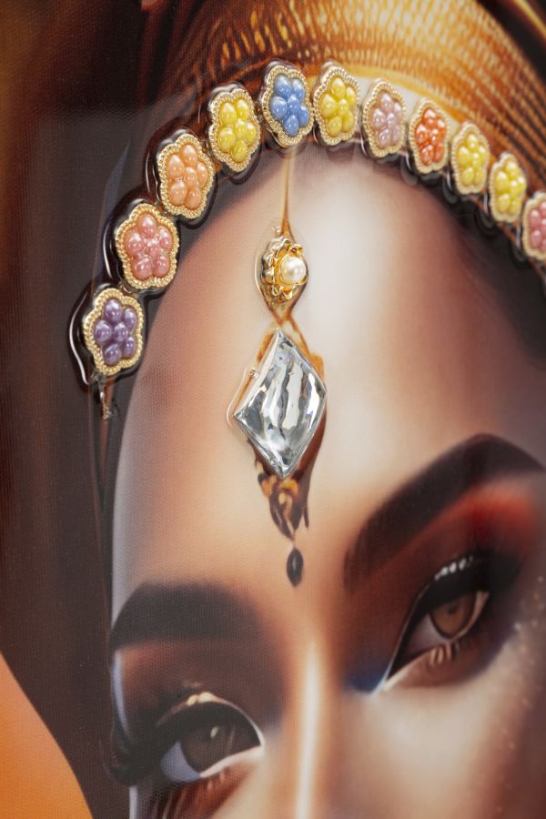 Adorne o seu espaço com a elegância intemporal desta pintura em tela, emoldurada com madeira de qualidade e um sofisticado acabamento metálico dourado. O quadro retrata uma mulher em trajes tradicionais e turbante, capturando uma fusão perfeita entre o clássico e o contemporâneo. Feito com materiais de excelência — metal, madeira de abeto e tela — este artigo não só eleva a decoração do seu lar, mas também garante durabilidade e resistência. Uma peça de arte que define o seu estilo com modernidade e requinte.