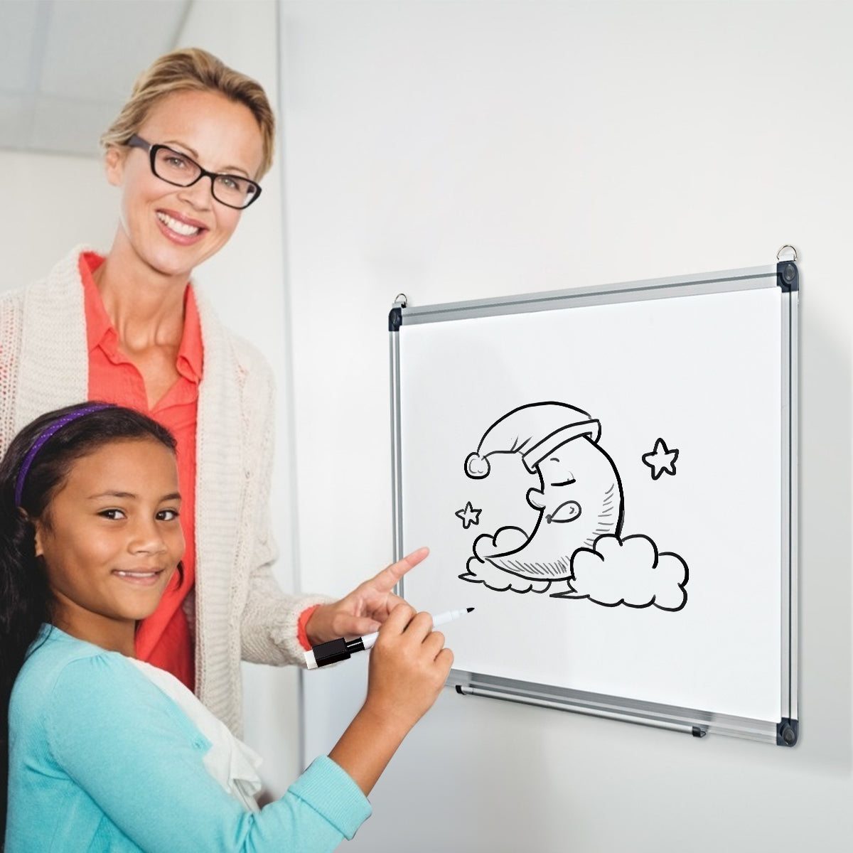 Características: superfície lisa para escrever, desenhar e apagar facilmente; estrutura em alumínio e cantos em ABS que não se deformam; pode ser pendurada na horizontal ou vertical com os ganchos; permite a fixação de notas, lembretes ou listas de compras com os ímanes; ideal para casa, escola, escritório, etc.; perfeita para leitura, apresentações, desenho, escrita, etc.; inclui um apagador, 2 ímanes e 3 marcadores.