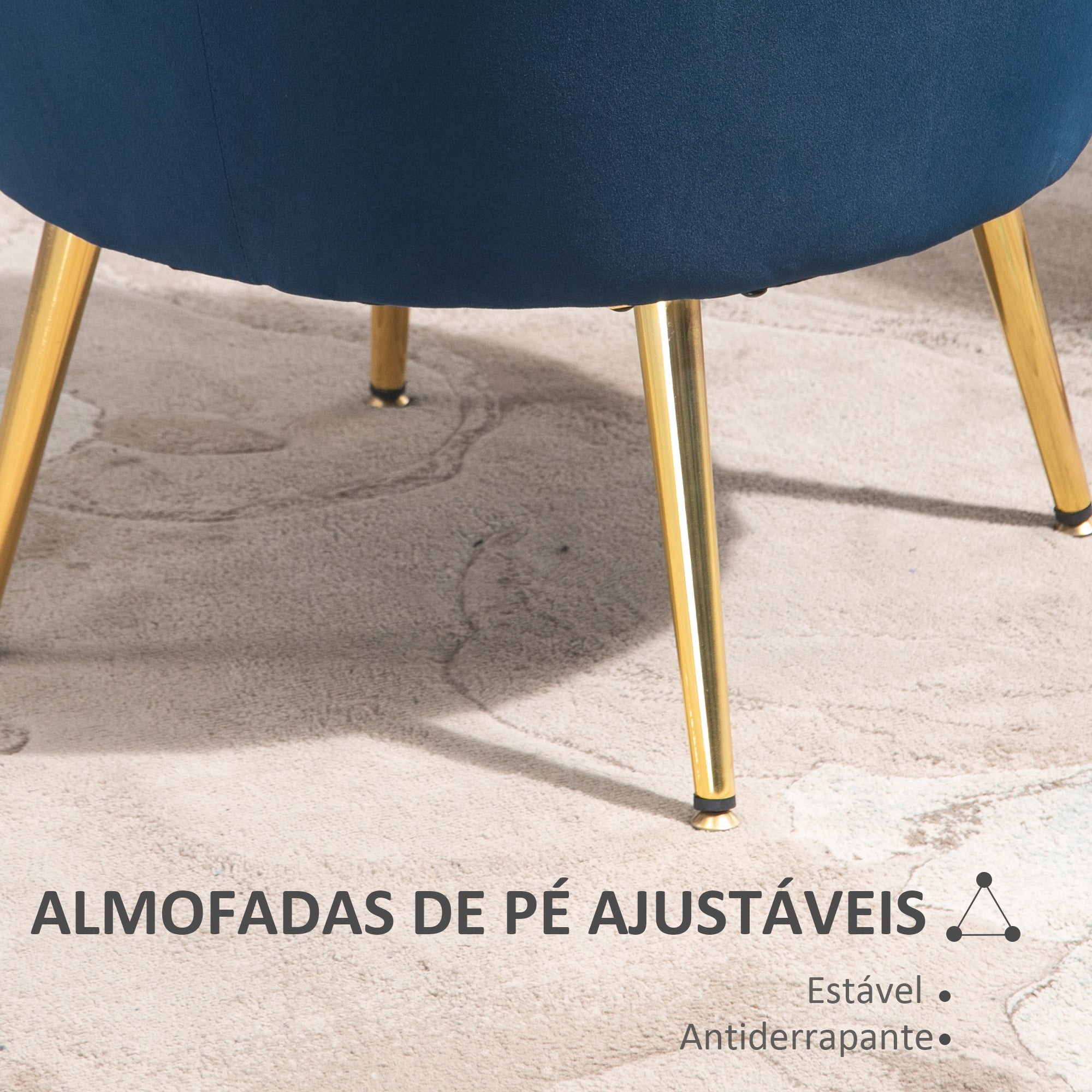 Esta poltrona estofada em veludo azul combina o estilo vintage com uma elegância única. Com um encosto em forma de concha e pernas douradas, é a peça perfeita para realçar qualquer espaço da sua casa.